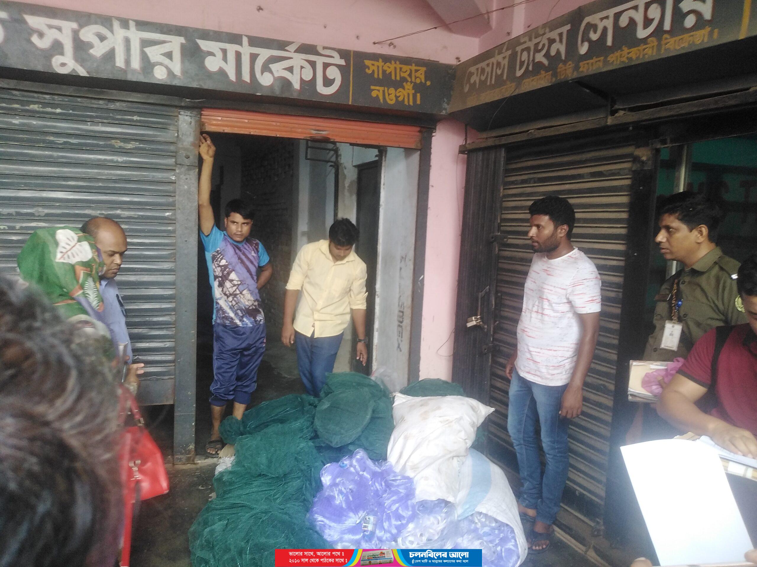 নওগাঁর সাপাহারে বুধবার দুপুরে আনোয়ার নামে সুতা ও সেলাই মেশিন ব্যবসায়ীর হক মার্কেট গোডাউন ঘরে মোবাইল কোর্ট অভিযান পরিচালনা করে লক্ষাধিক টাকার অবৈধ্য কারেন্ট ও রিং জাল জব্দ ও ১০ হাজার টাকা জরিমানা করা হয়েছে। মোবাইল কোর্ট পরিচালনা করেন এক্সিকিউটিভ ম্যাজিস্ট্রেস ও উপজেলা নির্বাহী অফিসার (ইউএনও) আব্দুল্যাহ আল মামুন।