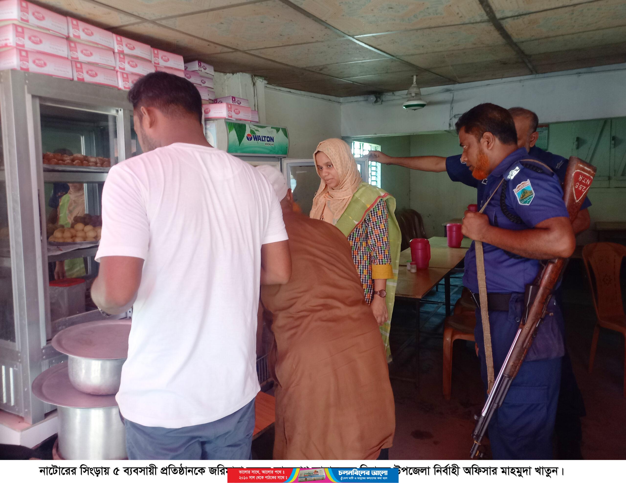 বিএসটিআইয়ের অনুমোদনবিহীন, মাপে ভেজাল ও অস্বাস্থ্যকর পরিবেশে দই-মিষ্টি তৈরি ও বিক্রি করায় ভ্রাম্যমাণ আদালতের অভিযানে সিংড়া বাজারের শিপ্রা দধি ও মিষ্টান্ন ভান্ডারকে ৭ হাজার টাকা, জননী দধি ও মিষ্টান্ন ভান্ডারকে ১ হাজার টাকা, জয় দধি ও মিষ্টান্ন ভান্ডারকে দেড় হাজার টাকা, মাদ্রাসা মোড়ে খাদিজা কসমেটিকসকে ৫ হাজার টাকা ও রংধনু কসমেটিকসকে ৫ হাজার টাকা জরিমানা করা হয়।