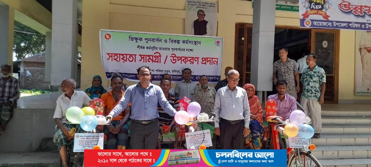 ঠাকুরগাঁওয়ের হরিপুরে ভিক্ষুক মুক্ত করনের লক্ষে পুনবার্সান ও বিকল্প কর্মসংস্থানের জন্য সহায়তা সামগ্রী হিসাবে ৩ জন ভিক্ষুককে চার্জার ভ্যান বিতরণ করা হয়েছে।এরা হলেন উপজেলা ধুকরিয়া গ্রামের ভিক্ষুক লালন বেগম, ভবান্দপুর গ্রামের আতাবুর রহমান,ও বহরমপুর গ্রামের শুসেন্ত চন্দ্র রায়। হরিপুর উপজেলা সমাজসেবা অফিসের আয়োজনে গতকাল রবিবার দুপুর ১২ টায় উপজেলা পরিষদ হল রুমের সামনে এ সব সহায়তা সামগ্রী বিতরণ করা হয়।এ সময় উপস্থিত ছিলেন উপজেলা পরিষদ চেয়ারম্যান জিয়াউর হাসান মুকুল, উপজেলা নির্বাহী অফিসার আরিফুজ্জামান, সমাজ সেবা অফিসার রাফিউল ইসলাম, আওয়ামী লীগের সম্পাদক এস এম আলমগীর, উপজেলা ভাইস চেয়ারম্যান আব্দুল কাইয়ুম, মহিলা ভাইস চেয়ারম্যান মোতাহারা পারভীন প্রমুখ।