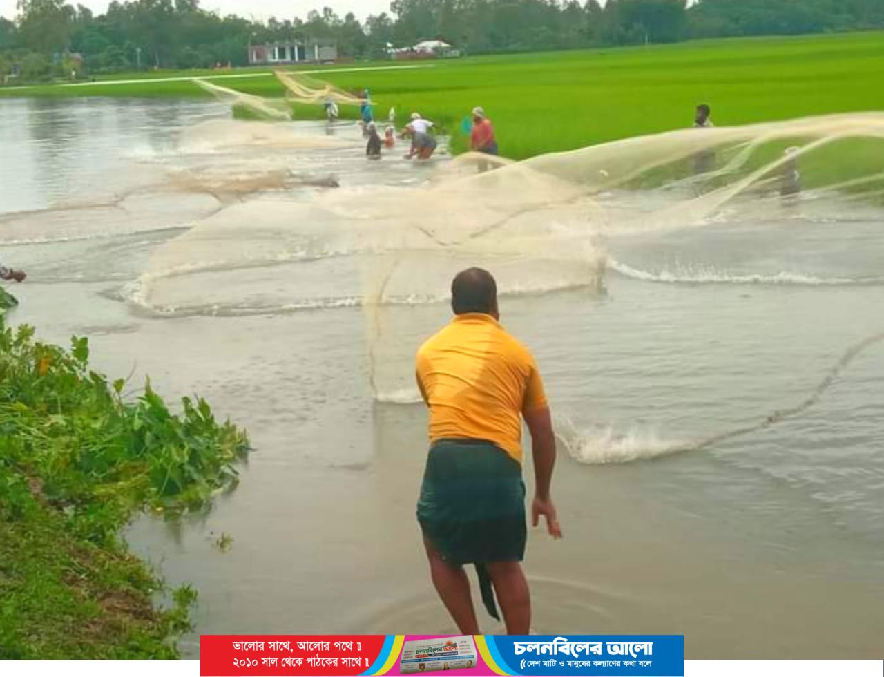 টানা বৃষ্টি উপেক্ষা করে বীরগঞ্জে চলছে মাছ ধরার উৎসব