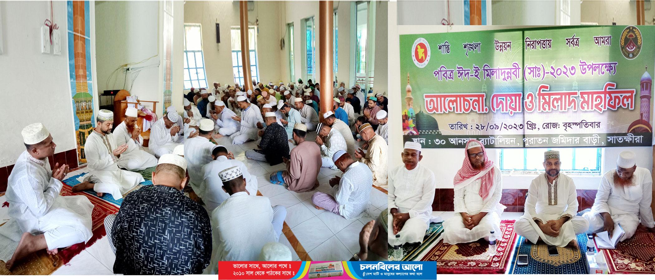 ১২-ই রবিউল আওয়াল। পবিত্র ঈদ-ই মিলাদুন্নবী (সা.)। ইসলামের সর্বশ্রেষ্ঠ মহামানব ও শেষ নবী হযরত মুহাম্মদ (সা.) এর জন্ম ও মৃত্যু দিবস। প্রায় সাড়ে ১৪শ বছর আগের এই দিনে আরবের মরু প্রান্তরে মা আমিনার কোল আলো করে পৃথিবীতে এসেছিলেন হযরত মুহাম্মদ (সা.)। তার জন্ম এমন এক সময় যখন গোটা আরববিশ্ব হানাহানি আর অন্যায়-অত্যাচারে ডুবে ছিলো। দীর্ঘ তপস্যার পর ৪০ বছর বয়সে তিনি নবুয়াত লাভ করেন। এরপর ইসলামের ধর্মের শান্তির বাণী প্রচার করে সারা বিশ্বে আলোরন সৃস্টি করেন। ইসলামের বার্তায় সব ধরণের কুসংস্কার, অন্যায়- অত্যাচার ও দাসত্বের শিকল থেকে মুক্ত হয়ে মানবতার স্বাদ নেয় আরব জাতি। দীর্ঘ ২৩ বছর ধর্ম প্রচার করে ৬৩ বছর বয়সে আরবি রবিউল আওয়াল মাসের ১২ তারিখেই ইহলোক ত্যাগ করেন মুহাম্মদ (সা.)। এ উপলক্ষে দিনটি পবিত্র ঈদ-ই মিলাদুন্নবী (সা.) হিসেবে পালন করে আসছে বাংলাদেশ সহ সারা বিশ্বে। সে আলোকে ৩০ আনসার ব্যাটালিয়ন পুরাতন জমিদার বাড়ী সাতক্ষীরা অত্র ব্যাটালিয়নের কোয়াটার গার্ডে পতাকা উত্তলনের মধ্য দিয়ে দিনের কার্যক্রম শুরু হয়।পরে জামে মসজিদে সকাল ১০ঘটিকায় পবিত্র ঈদ-ই মিলাদুন্নবী (সা.) উপলক্ষে আলোচনা,দোয়া ও মিলাদ মাহফিল অনূষ্ঠনের আয়োজন করেন। অনুষ্ঠানে পরিচালক এনামুল খাঁন প্রধান অতিথি হিসেবে উপস্থিত থেকে  সর্বশ্রেষ্ঠ মহামানব ও শেষ নবী হযরত মুহাম্মদ (সা.) এর জীবনি নিয়ে সংক্ষিপ্ত আলোচনা করেন। আরো আলেচনা করেন অতিথি বক্তা-মাওলানা হাফেজ আব্দুস সালাম, হাবিলদার মোঃ সরোয়ারদী পেশ ইমাম, ল্যান্স নায়েক মোঃ আসাদুজ্জামান, ব্যাটালিয়ন আনসার মোঃ শওকত হোসাইন। অনুষ্ঠানে হামদ্, নাথ, গজল পরিবেশন করেন কোম্পানী কমান্ডার মাইনুল হাসান,ব্যাটালিয়ন আনসার মোঃ রিয়াজ, ব্যাটালিয়ন আনসার মোঃ শাকিল আহাম্মেদ, ব্যাটালিয়ন আনসার মোঃ শাহজাহান আলী, ব্যাটালিয়ন আনসার মোঃ আশিকুর রহমান, ল্যান্স নায়েক মোঃ শামীম পারভেজ, ব্যাটালিয়ন আনসার আব্দুল বারেক। আলোচনা শেষে অংশগ্রহনকারী সকলকে পরিচালক এনামুল খাঁন পুরস্কার প্রদান করেন। অনুষ্ঠান শেষে পরিচালক এনামুল খাঁন সকলের সাথে যোহরের নামাজ আদায় করেন এবং নামাজ শেষে মোনাজাতে অংশ গ্রহণ করেন। মোনাজাত পরিচালনা করেন  অতিথি মাওলানা  হাফেজ আব্দুস সালাম।