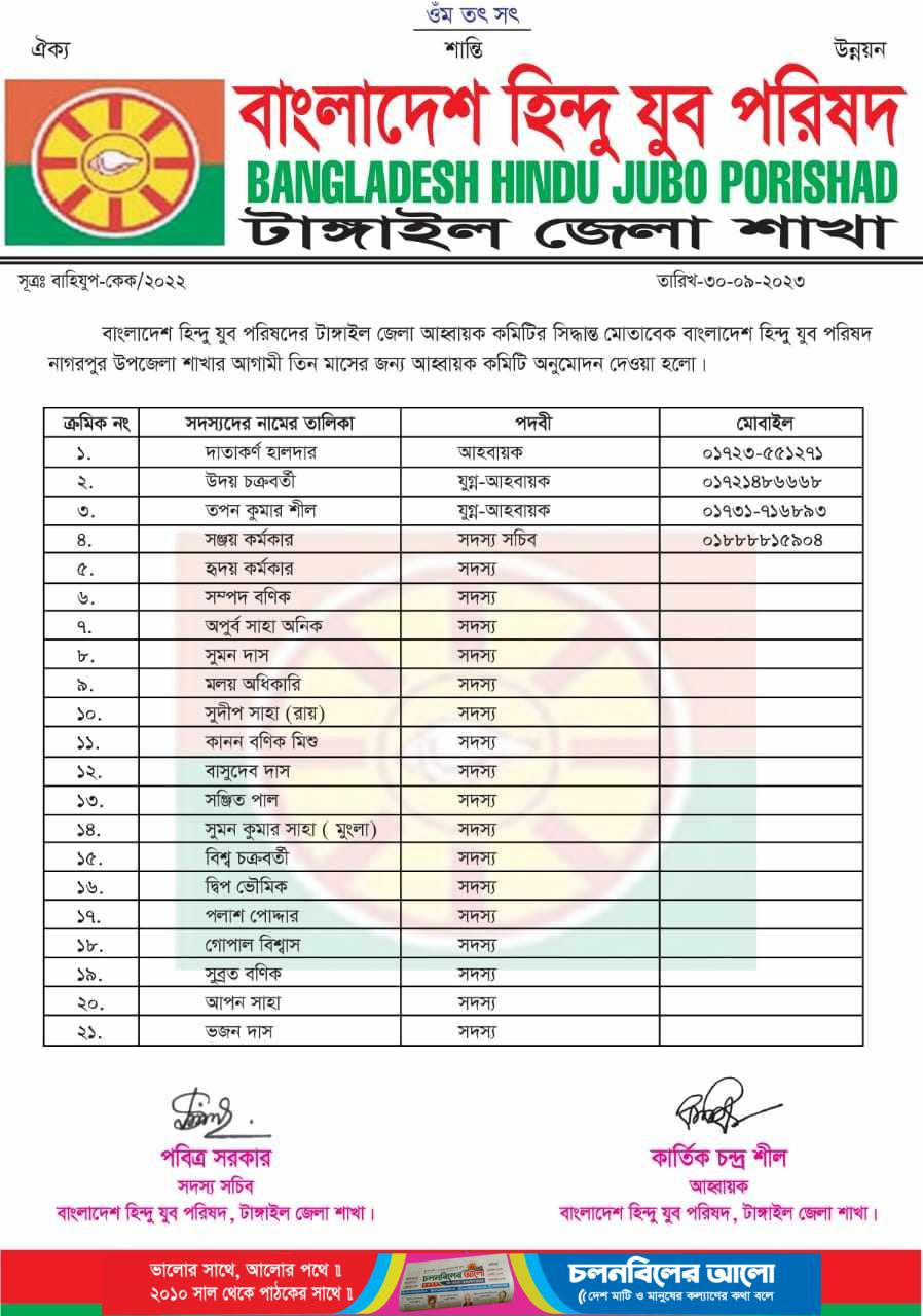 উল্লেখ্য; আগামী ৩ মাসের জন্য এ আহবায়ক কমিটির অনুমোদন দিয়েছেন টাঙ্গাইল জেলা হিন্দু যুব পরিষদ আহবায়ক কমিটি।
