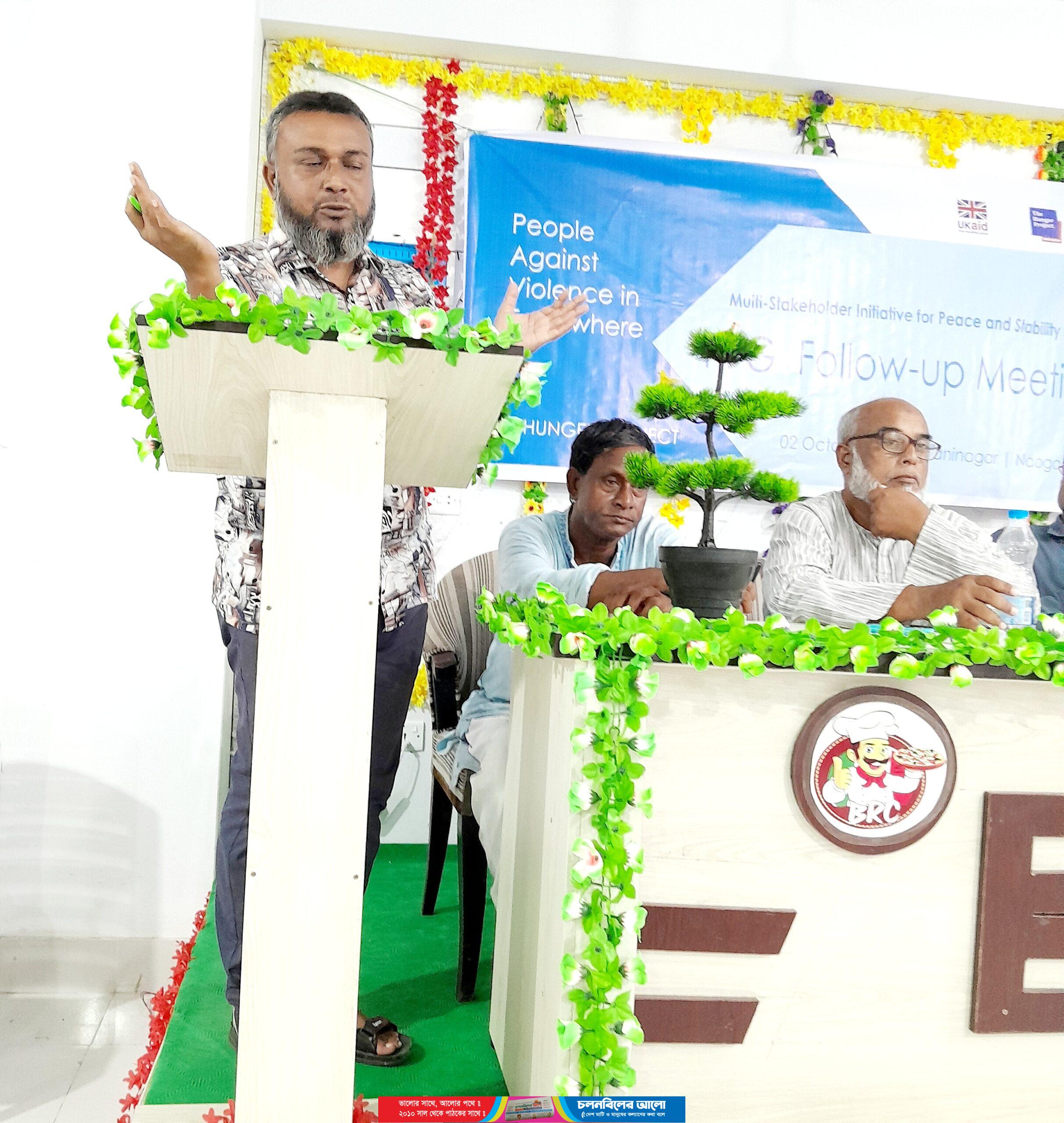 সোমবার বেলা ১১টায় পিএফজি গ্রুপের আয়োজনে রাণীনগর উপজেলা আওয়ামীলীগের সাবেক যুগ্ন সাধারণ সম্পাদক রাহিমুল বাশার বাবলু’র সভাপতিত্বে অনুষ্ঠিত সভায় বক্তব্য রাখেন, রাণীনগর হিন্দু বদ্ধ খিষ্টান ঐক্য পরিষদের সভাপতি চন্দন কুমার মহন্ত, রাণীনগর থানা বিএনপি’র, আহবায়ক কমিটির সদস্য এসএম মুনজুরুল রশীদ,জাতীয় পার্টির সাধারণ সম্পাদক, কমিউনিস্ট পার্টির বীর মুক্তিযোদ্ধা মুনছুর রহমান, যুবদলের যুগ্ন আহবায়ক সিরাজে আলম, শ্রমিক দলের সভাপতি নাসির উদ্দিন টনি, ছাত্রলীগের সাবেক সহ সভাপতি শামীম হোসেন, হাঙ্গার প্রজেক্টের, রাজশাহী,ময়মনসিংহওরংপুরের এরিয়া কো-অডিনেটর আব্দুর রাজ্জাক, এফজি’র রাণীনগর কমিটির কো-অডিনেটর সাইদুজ্জামান সাগর, অ্যাম্বাসেডর, আব্দুল আজিজ, শামীম হোসেন, মর্জিনা বেগম প্রমুখ।