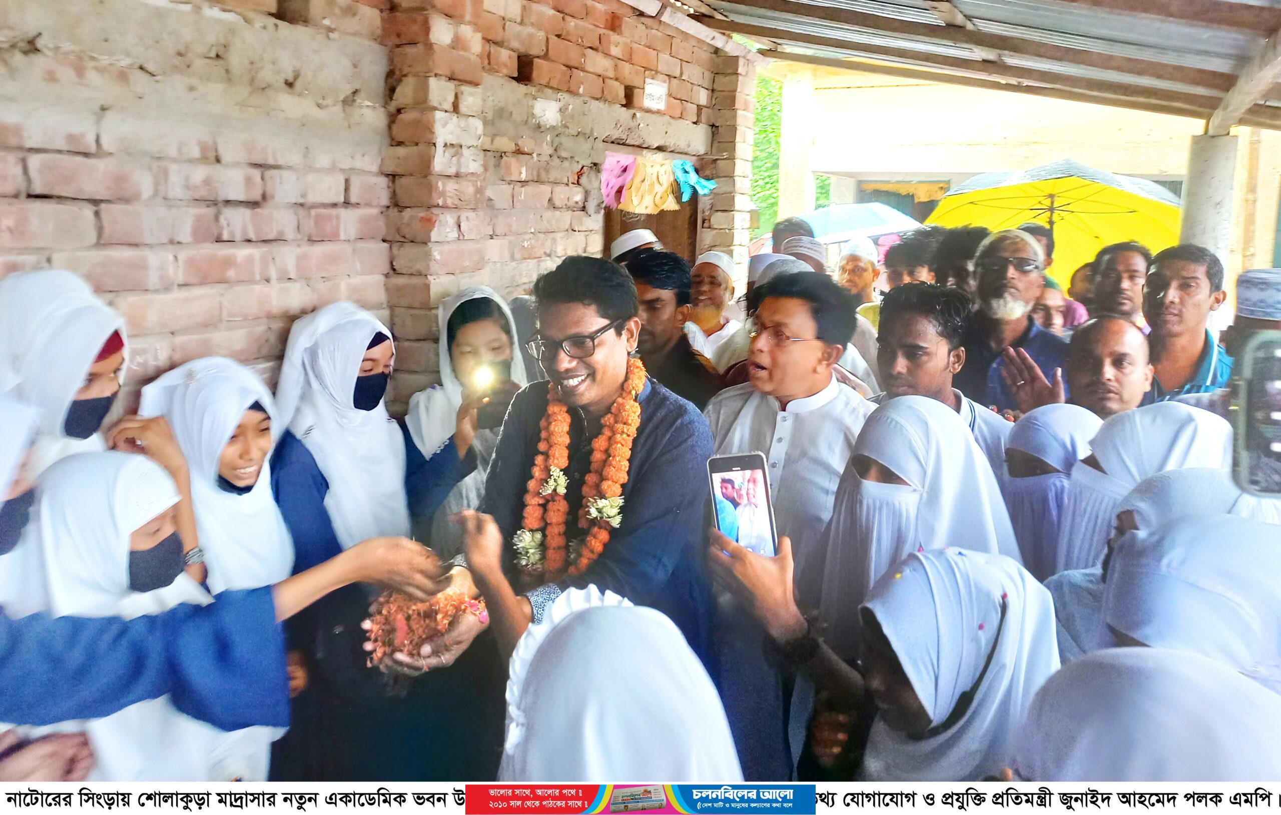 বৃহস্পতিবার (৫ অক্টোবর) দুপুর ১টায় সিংড়া পৌর শহরের শোলাকুড়া ইসলামিয়া আলিম মাদ্রাসার নতুন একাডেমিক ভবনের উদ্বোধন অনুষ্ঠানে বৃষ্টি উপেক্ষা করে প্রধান অতিথি হিসেবে উপস্থিত হলে মাদ্রাসার শিক্ষার্থীরা প্রতিমন্ত্রীকে ফুলেল শুভেচ্ছায় সিক্ত করেন।
