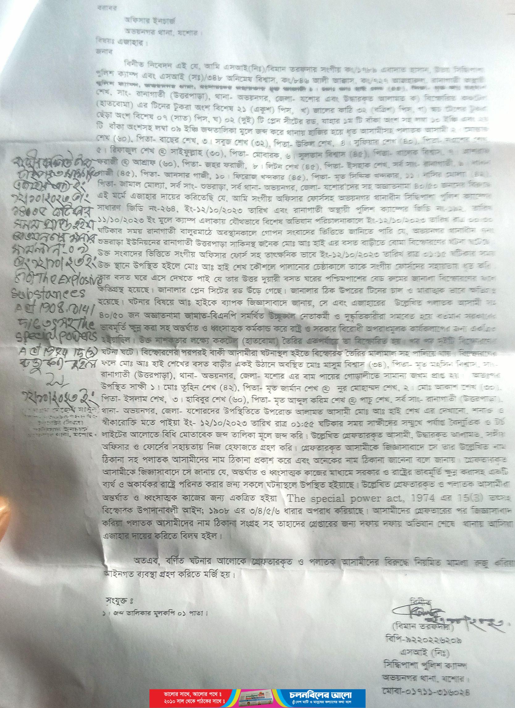 যশোরের অভয়নগরে সরকারের ভাবমূর্তি ক্ষুণ্ন করতে রানাগাতি এলাকায় সংঘবদ্ধ চক্রের বোমা হামলার প্রস্তূতির সময় বিষ্ফোরণের ঘটনা ঘটেছে। এব্যাপারে অভয়নগর থানায় ১১ জনের নাম উল্লেখ করে অজ্ঞাত ৪০/৫০ জনের নামে একটি মামলা হয়েছে যার নং ০৯ তারিখ ১২/১০/২০২৩ ইং। মামলা সূত্রে জানা গেছে, গত ১২/১০/২০২৩ দিবাগত রাত আনুমানিক ১.১৫ টার সময় অভয়নগর এলাকায় নাশকতা ও সরকারের ভাব মূর্তি ক্ষুণ্ন করার উদ্দেশ্যে উপজেলার রানাগাতি উত্তর পাড়ার মৃত আব্দুর রহমান শেখের পুত্র আব্দুল হাই(৫৫) শেখ’র বাড়িতে সংঘবদ্ধ চক্রের বোমা বানানোর সময় অসাবধানতাবশত বিষ্ফোরণ ঘটে। এতে ঘরের চাল উড়ে যাওয়াসহ আশেপাশের বাড়িগুলো ক্ষতিগ্রস্ত হওয়াসহ বাসিন্দারা আহত হয়। খবর পেয়ে পুলিশ বোমা বিস্ফোরণে ব্যবহারিত আলামত জব্দ ও একজনকে আটকসহ ১১ জনের নাম উল্লেখসহ ৪০/৫০ জন অজ্ঞাত ব‍্যক্তিকে আসামি করে, অভয়নগর থানার অধীন উত্তর সিদ্দিপাশা পুলিশ ক‍্যাম্পের আইসি এসআই বিমান তরফদার বাদি হয়ে আন্তর্ঘাত ও ধ্বংসাত্বক কাজের মাধ্যমে সরকার ও রাষ্ট্রের ভাবমূর্তি ক্ষুণ্ন করাসহ বিস্ফোরণ ঘটানোর অপরাধে একটি মামলা দায়ের করেন।
