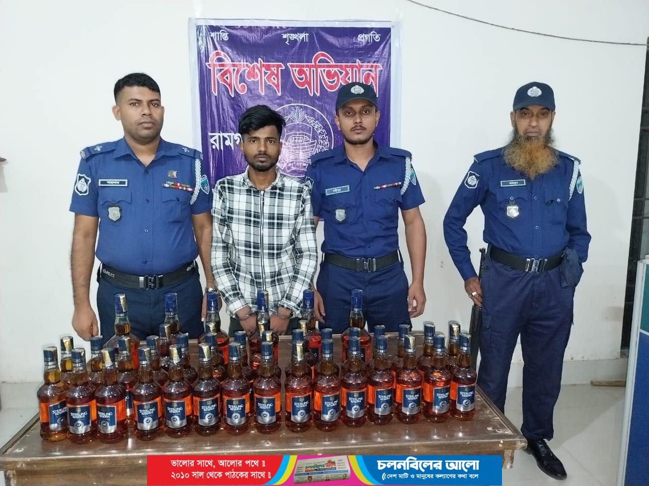 খাগড়াছড়ির রামগড়ে চোরাই পথে আসা ভারতীয় ৪০ বোতল মদ সহ ১ জনকে আটক করেছে রামগড় থানা পুলিশ।গতকাল সোমবার গভীর রাতে রামগড় পৌরসোভার দারোগাপড়া এলাকার আনসার ভিডিপি ক্যাম্পের পাশে অভিযান চালিয়ে তাকে আটক করা হয়। আটককৃত একরাম হোসেন রামগড় পৌরসভার বল্টুরাম টিলা এলাকার আবুল হোসেনের ছেলে। রামগড় থানার উপ পরিদর্শক মহসিন মোস্তফা জানান, গোপন সংবাদের ভিত্তিতে আসামীর গতি প্রকৃতি লক্ষ করে অভিযান পরিচালনা করা হয়।এসময় আনসার ভিডিপি কার্যালয়ের সামনে তাকে ধাওয়া করে আটক করা হয়।এসময় তার কাছে থাকা ৪০বোতল ভারতীয় মদ জব্দ করা হয়। রামগড় থানার ভারপ্রাপ্ত কর্মকর্তা (ওসি)মিজানুর রহমান জানান,মদ সহ একজনকে আটক করা হয়েছে। এ ঘটনায় রামগড় থানায় তার বিরুদ্ধে মাদক দ্রব্য আইনে মামলা করা হয়েছে।তিনি আরো জানান,মাদকের বিরুদ্ধে রামগড় থানা জিরো টলারেন্স নীতি গ্রহণ করেছে।সমূলে মাদক কারবারিদের নির্মূল করা হবে।