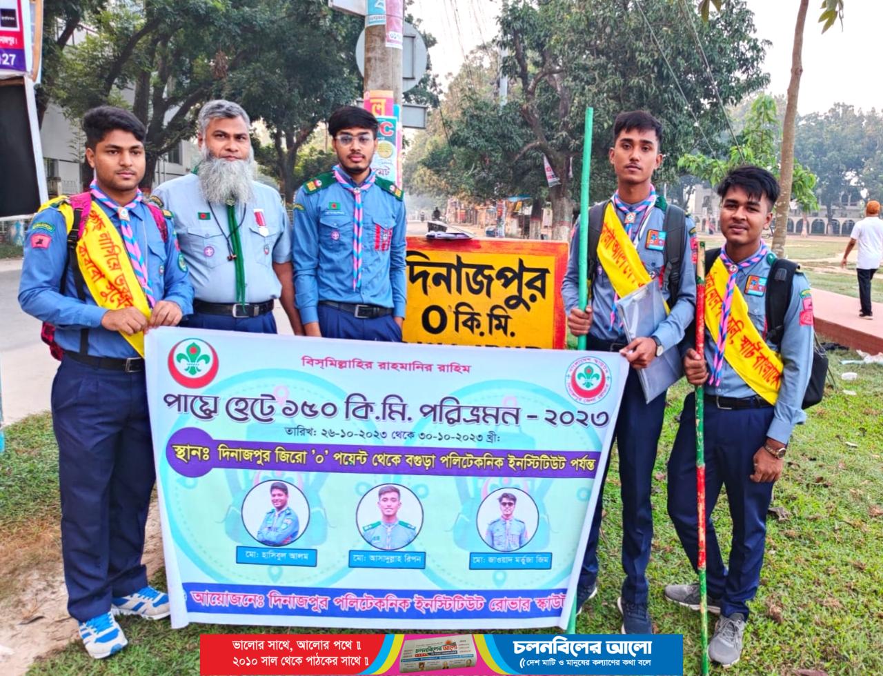 প্রেসিডেন্ট রোভার স্কাউট অ্যাওয়ার্ড অর্জনের লক্ষ্যে পায়ে হেঁটে ১৫০ কিলোমিটার পরিভ্রমণ শুরু করেছে দিনাজপুর পলিটেকনিক ইনস্টিটিউট রোভার স্কাউট গ্রুপের তিন চৌকস রোভার তারা হলেন হাসিবুল আলম (১৮), আসাদুল্লাহ রিপন(১৯), জাওয়াদ মূর্তজা জিম (১৯)।