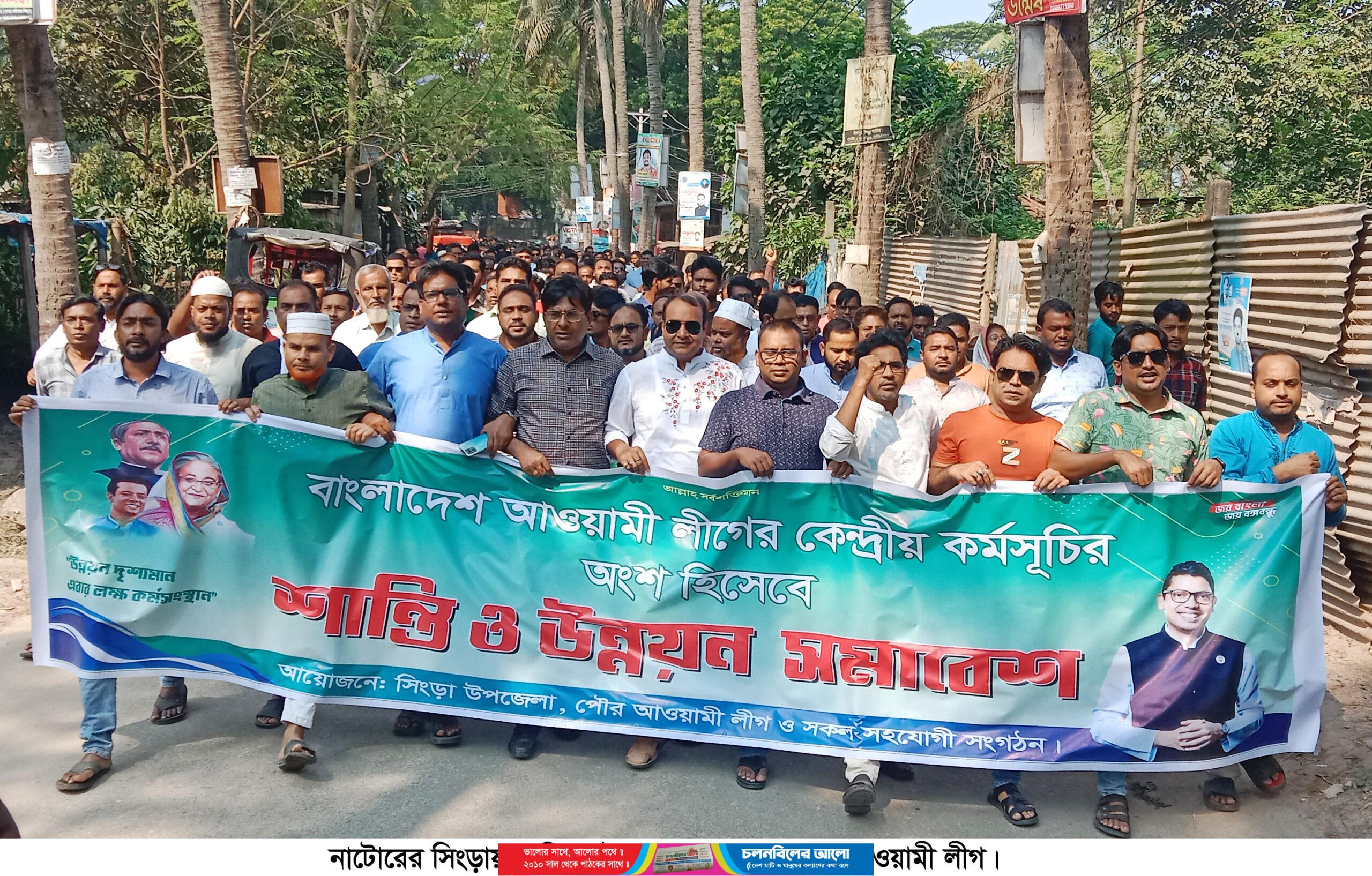 কেন্দ্রীয় কর্মসূচির অংশ হিসেবে নাটোরের সিংড়ায় শান্তি ও উন্নয়ন সমাবেশ করেছে আওয়ামী লীগ। রোববার (২৯ অক্টোবর) সকাল সাড়ে ১০টায় দলীয় কার্যালয় থেকে একটি মিছিল শহর প্রদক্ষিণ শেষে নাটোর-বগুড়া মহাসড়কের সিংড়া টার্মিনাল এলাকায় উপজেলা ও পৌর আওয়ামী লীগসহ অঙ্গসংগঠনের নেতাকর্মীরা শান্তি সমাবেশ করে।