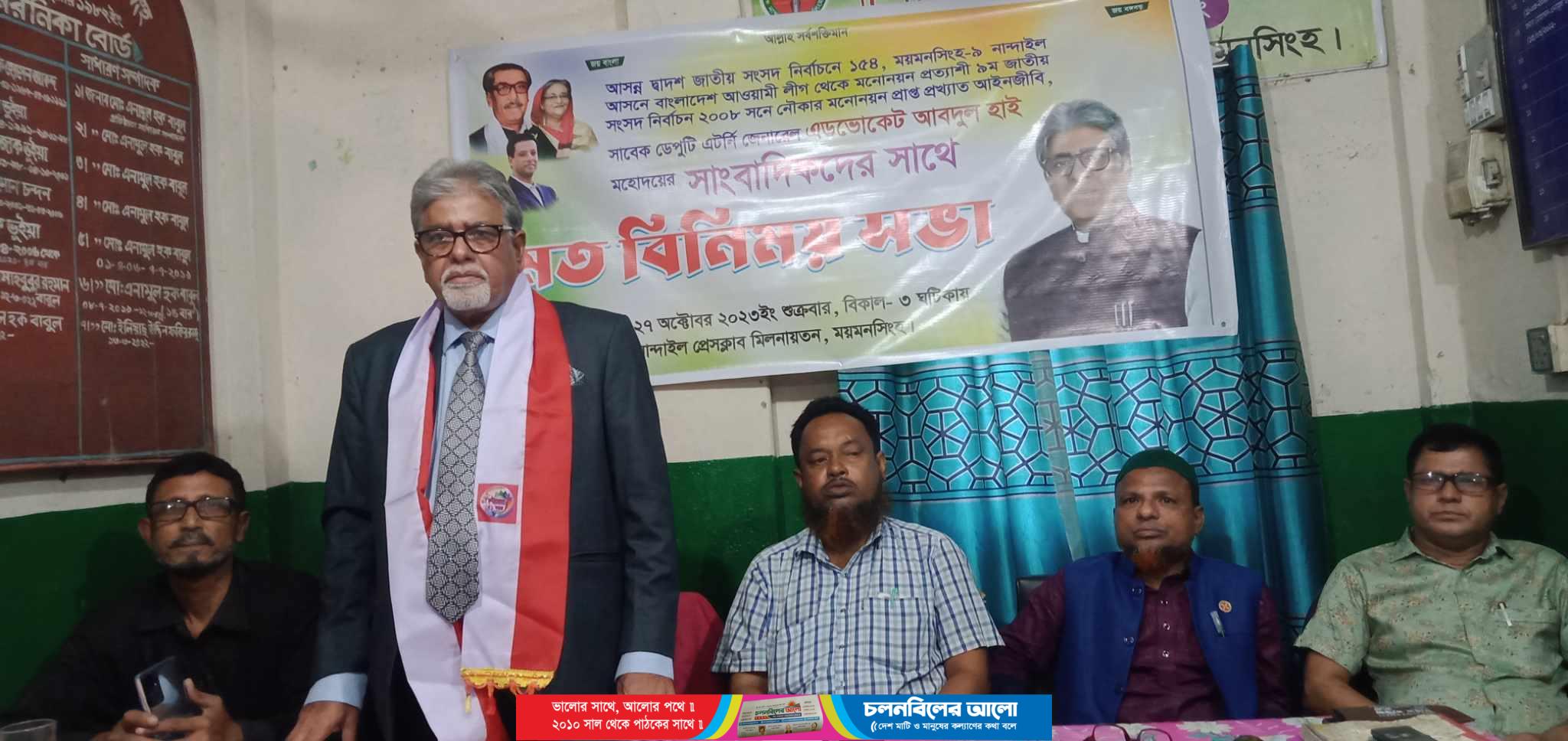 আসন্ন দ্বাদশ জাতীয় সংসদ নির্বাচনে ময়মনসিংহ-৯ নান্দাইল আসনে বাংলাদেশ আওয়ামীলীগ থেকে মনোনয়ন প্রত্যাশী এডভোকেট আবদুল হাই নান্দাইল প্রেসক্লাব মিলনায়তনে সাংবাদিকদের সাথে মতবিনিময় সভা করেন। তিনি বিগত ৯ম জাতীয় সংসদ নির্বাচন (২০০৮ সনে) নৌকার মনোনয়ন প্রাপ্ত হন। পরে অনিবার্য কারণে নির্বাচন থেকে সরে আসেন এবং নির্বাচনে নৌকার পক্ষে মাঠে থেকে কাজ করেন। এডভোকেট আবদুল হাই বাংলাদেশ সুপ্রীমকোর্টের সাবেক ডেপুটি এ্যাটর্নী জেনারেল হিসাবে দায়িত্ব পালন করেছেন। মতবিনিময় সভায় এডভোকেট আবদুল হাই তাঁর বক্তব্যে বলেন, আমি বঙ্গবন্ধুর আদর্শের একজন সৈনিক হিসেবে কাজ করে যাচ্ছি। জাতির জনকের কন্যা জননেত্রী শেখ হাসিনা সুযোগ্য নেতৃত্বে বাংলাদেশ এগিয়ে যাচ্ছে। জননেত্রী শেখ হাসিনার নেতৃত্বে কারণে বাংলাদেশ এখন বিশ্ব দরবারে উন্নয়নের রোল মডেল। দেশের জনগনের একমাত্র আস্থার ঠিকানা, ভরসার ঠিকানা হচ্ছে প্রধানমন্ত্রী শেখ হাসিনা। বঙ্গবন্ধু কন্যা শেখ হাসিনার বিকল্প একমাত্র তিনি নিজেই। আগামী নির্বাচনে টানা চতুর্থ বার এবং পঞ্চম বারের মতো বঙ্গবন্ধু কন্যা জননেত্রী শেখ হাসিনাকে দেশের মানুষ আবারও ক্ষমতায় আনতে প্রস্তুত রয়েছে। কারণ বাংলাদেশের উন্নয়ন একমাত্র শেখ হাসিনার মাধ্যমেই সম্ভব, তার বিকল্প কেউ নেই। তিনি আরও বলেন, দেশের বর্তমান প্রেক্ষাপটে নান্দাইলের অগ্রগতি ও উন্নয়রে ধারা অব্যাহত রাখতে আবারও দ্বাদশ জাতীয় সংসদ নির্বাচনে বাংলাদেশ আওয়ামীলীগের সভানেত্রী মাননীয় প্রধানমন্ত্রী দেশরত্ম জননেত্রী শেখ হাসিনার নিকট নৌকার মনোনয়ন চাইবেন। এডভোকেট আবদুল হাই বলেন, আমি দ্বাদশ জাতীয় সংসদ নির্বাচনে বাংলাদেশ আওয়ামীলীগ থেকে নৌকার মনোনয়ন পাওয়ার ব্যাপারে আশাবাদী। আগামী দ্বাদশ জাতীয় সংসদ নির্বাচনে মাননীয় প্রধানমন্ত্রী জননেত্রী শেখ হাসিনা যদি আমাকে মনোনয়ন দেন তাহলে আমি জননেত্রী শেখ হাসিনাকে নান্দাইল আসনটি উপহার দিতে পারব বলে আশাবাদ ব্যক্ত করেন।
