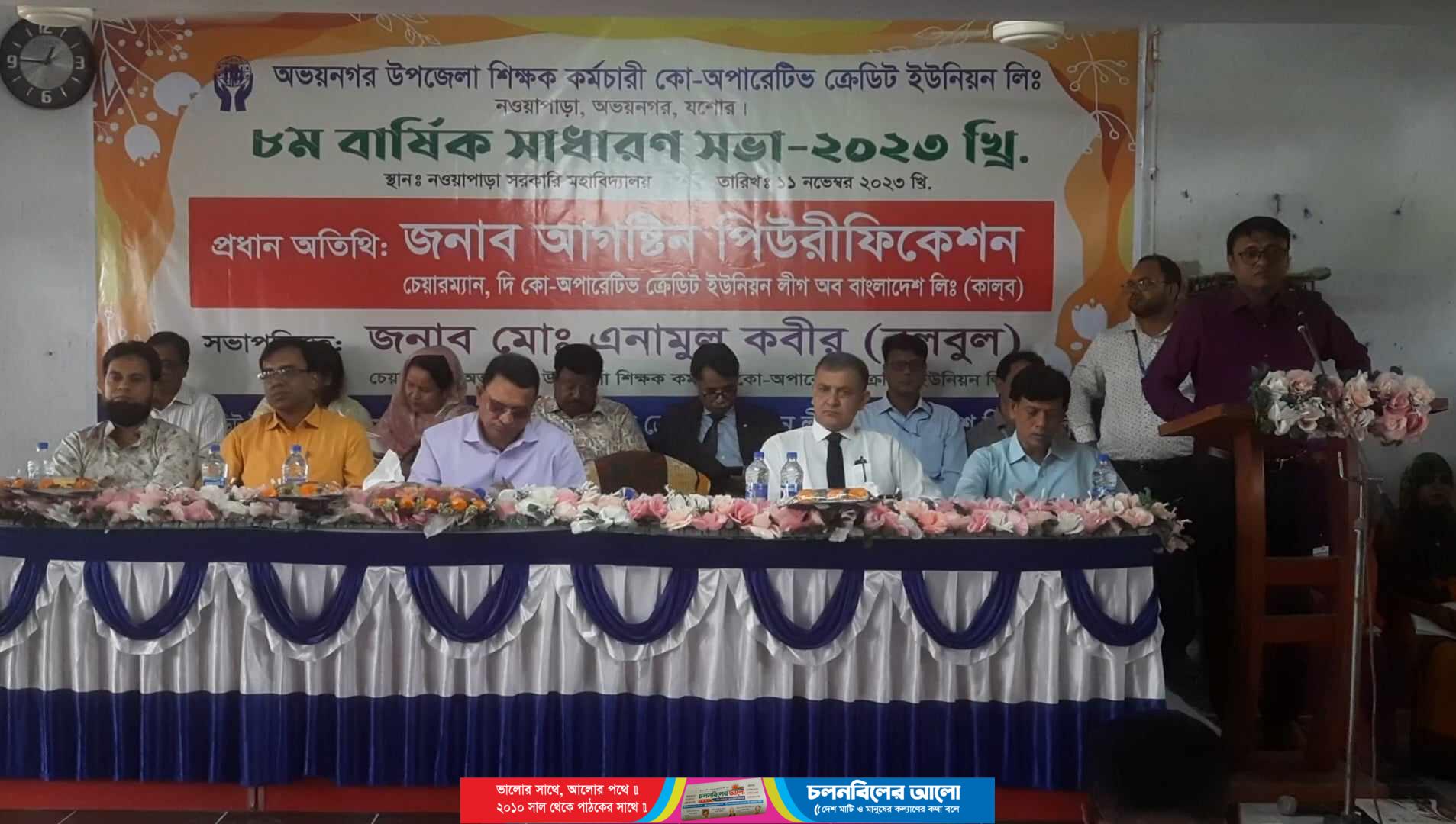 যশোরের অভয়নগর উপজেলা শিক্ষক কর্মচারী কো-অপারেটিভ ক্রেডিট ইউনিয়ন লিমিটেডের ৮ম বার্ষিক সাধারণ সভা ২০২৩ অনুষ্ঠিত হয়েছে। ১১নভেম্বর শনিবার সকালে নওয়াপাড়া সরকারি মহাবিদ্যালয়ের হল রুমে সংগঠনের সভাপতি এনামুল কবির বুলবুল এর সভাপতিত্বে অনুষ্ঠানে প্রধান অতিথির বক্তব্য রাখেন কলব এর চেয়ারম্যান আগষ্টিন পিউরিফিকেশন। সম্মানিত অতিথি হিসেবে উপস্থিত থেকে বক্তব্য রাখেন নওয়াপাড়া সরকারি মহাবিদ্যালয় অধ্যক্ষ মো. রবিউল হাসান, ট্রেজারার নরেশ চন্দ্র বিশ্বাস, উপজেলা সমবায় কর্মকর্তা উবাইদুজ্জামান, ডিরেক্টর মো.আরিফ হাসান, ডুমুরিয়া উপজেলা কালব এর সভাপতি মো.শহিদুল ইসলাম, খুলনা মহানগর টিসি সভাপতি অধ্যক্ষ মোছা:নাদিরা পারভীন, ট্রেনিং কর্মকর্তা আ:মান্নান, উপজেলা সাবেক সভাপতি ধীরেন্দ্র নাথ বিশ্বাস, কালব এর জেলা ব্যবস্হাপক মো. হাফিজুর রহমান, জেলা প্রোগ্রামার মো.আনিসুর রহমান। এছাড়াও উপস্থিত ছিলেন দিপক রায়, মারুফ মোস্তফা, বাদল, শিউলী, রানা দাস, মুজিবুর রহমান আয়শা খাতুন, সহ- সভাপতি দিপক রায় , শাহানা পারভীন সঞ্চালনা করেন কালব এর সদস্য মো.শরিপুল ইসলাম।