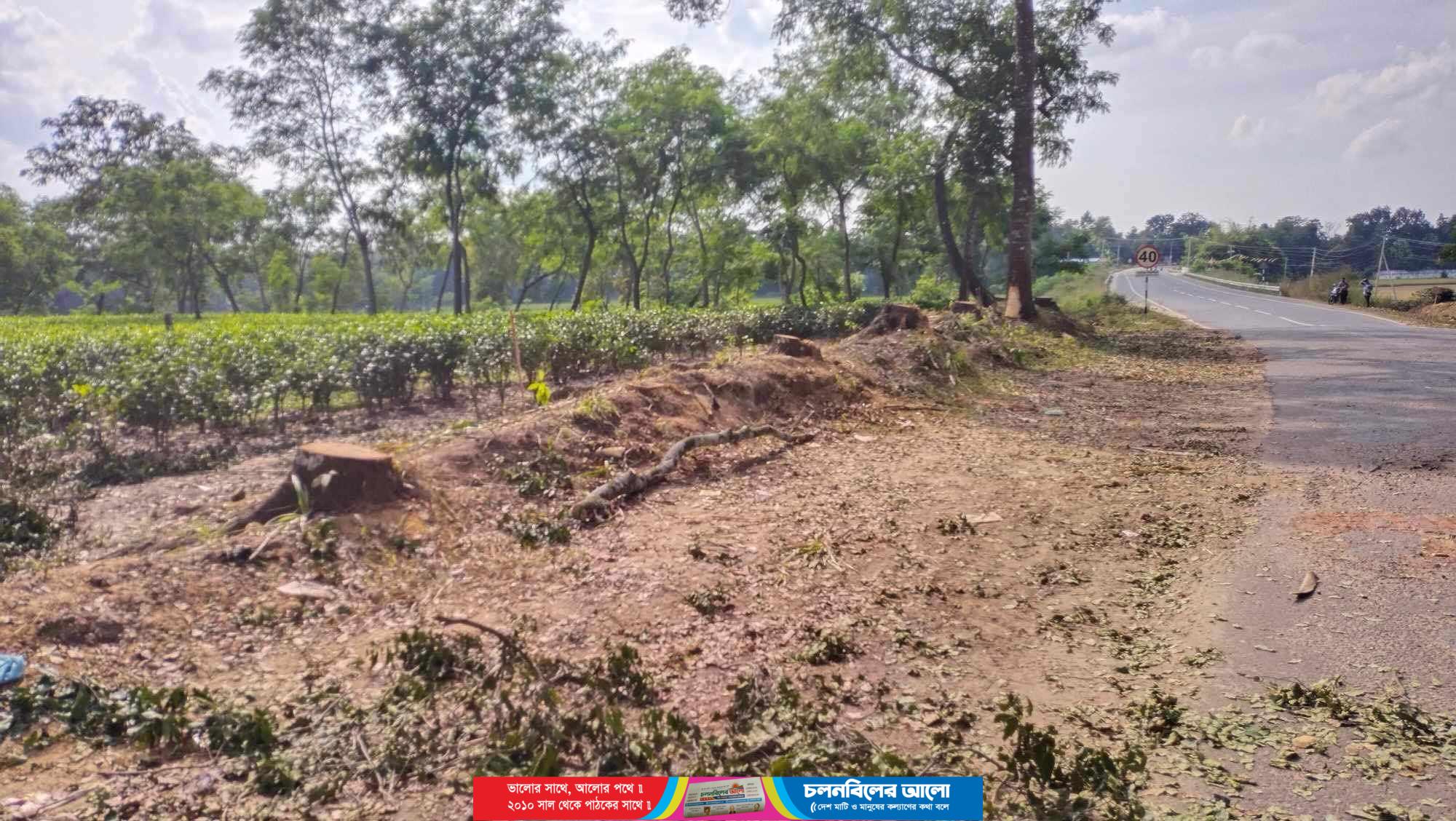 নির্বিচারে মহাসড়কের পাশের গাছ কাটছে চা বাগান কর্তৃপক্ষ,