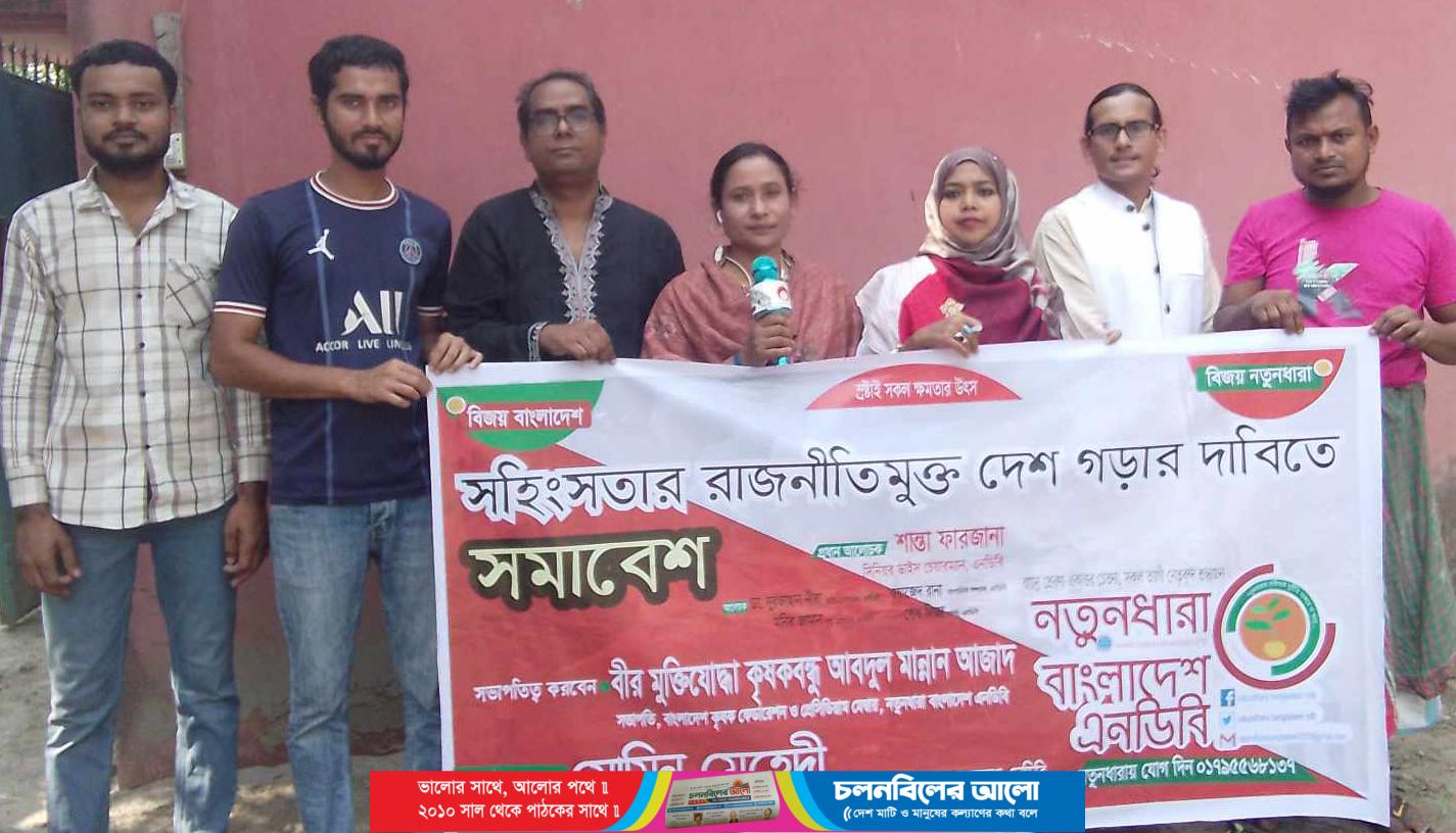 সহিংসতার রাজনীতিমুক্ত দেশ গড়ার দাবিতে সমাবেশ করেছে নতুনধারা বাংলাদেশ এনডিবি। ২১ নভেম্বর সকালে হরতাল-অবরোধমুক্ত রাজনীতির আহবান জানিয়ে অনুষ্ঠিত সমাবেশে সভাপতিত্ব করেন নতুনধারা বাংলাদেশ এনডিবির চেয়ারম্যান মোমিন মেহেদী। বক্তব্য রাখেন নতুনধারার প্রেসিডিয়াম মেম্বার বীর মুক্তিযোদ্ধা ফজলুল হক, সিনিয়র ভাইস চেয়ারম্যান শান্তা ফারজানা, ভাইস চেয়ারম্যন চন্দন চন্দ্র সেন, ভারপ্রাপ্ত মহাসচিব নিপুন মিস্ত্রী, সাংগঠনিক সম্পাদক ওয়াজেদ রানা, শেখ লিজা প্রমুখ।