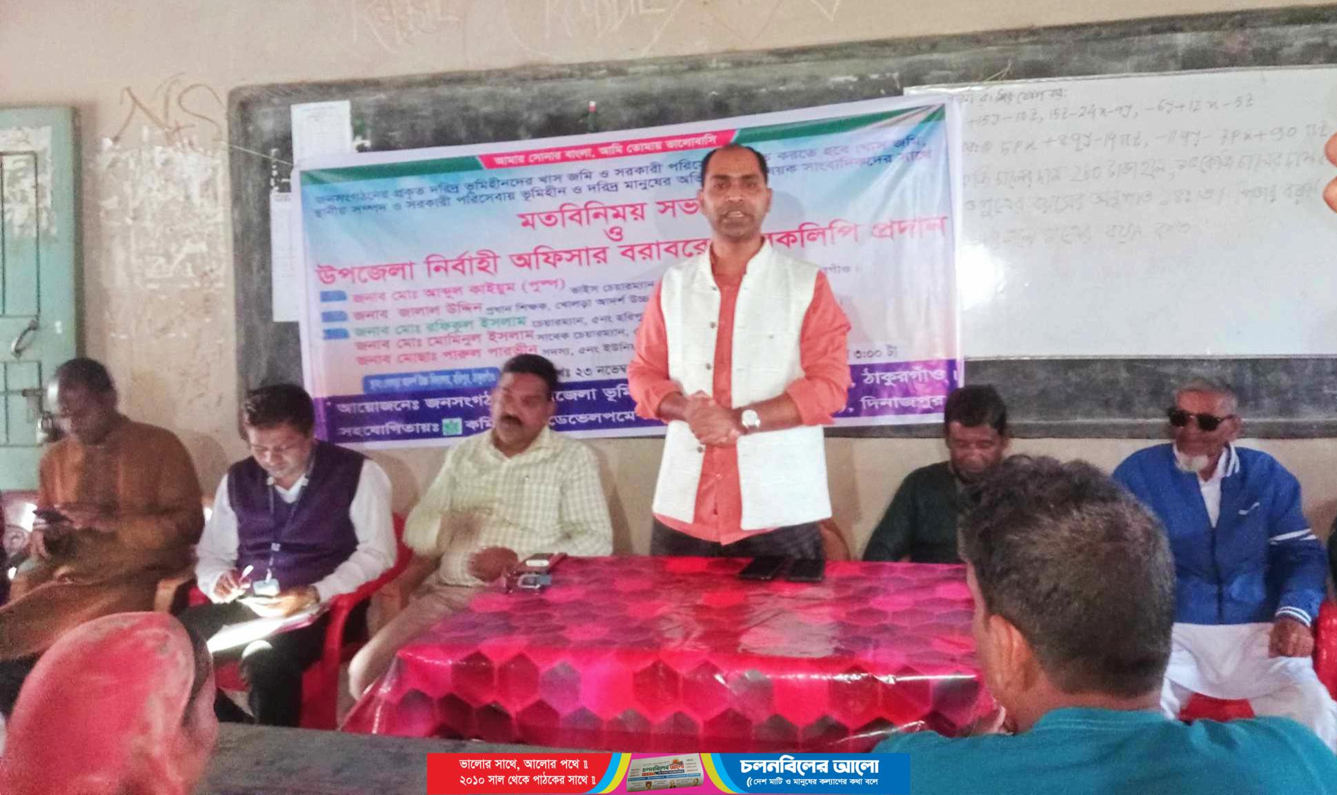 ঠাকুরগাঁওয়ের হরিপুরে ভূমি দস্যু কর্তৃক সরকারী খাস জমি অবৈধ ভাবে দখল এবং ভূমি হীনদের খাস জমিতে প্রবেশাধিকারে বাধা ও মিথ্যা ও হয়নানী মূলক মামলার প্রতিবাদে এবং ভূমি দস্যুদের দ্বারা দখলকৃত সরকারী খাস জমি উদ্ধার করে প্রকৃত ভূমি হীনদের মাঝে বন্দো বস্তের দাবীতে হরিপুর উপজেলা ভূমিহীন সমন্বয় পরিষদ ও জন সংগঠনের নেতৃবৃন্দ হরিপুর প্রেসক্লাবের সাংবাদিকদের সাথে এক মতবিনিময় সভা করেছেন। গতকাল বৃহস্পিতিবার বিকাল ৫ টায় ভূমিহীন জন সংগঠনের আয়োজনে ও সিডিএ দিনাজপুর এর সহয়তায় খলড়া আদর্শ উচ্চবিদ্যালয় হলরুমে সংগঠনের সভাপতি মোবারক আলীর সভাপতিত্বে মতবিনিময় সভা অনুষ্ঠিত হয়। এতে বক্তব্য রাখেন উপজেলা ভাইস চেয়াম্যান ও আওয়ামী লীগ সহ সভাপতি আব্দুল কাইয়ুম পুষ্প, হরিপুর ৫নং ইউনিয়ন চেয়ারম্যা রফিকুল ইসলাম, হরিপুর প্রেসক্লাবের সভাপতি সুজা, সম্পাদক আব্দুর রশিদ, সাংবাদিক, রাজু, বরকতুল্লাহ প্রমুখ। সভায় জন সংগঠনের কর্মকর্তা ও সকল সদস্যগণ উপস্থিত ছিলেন।