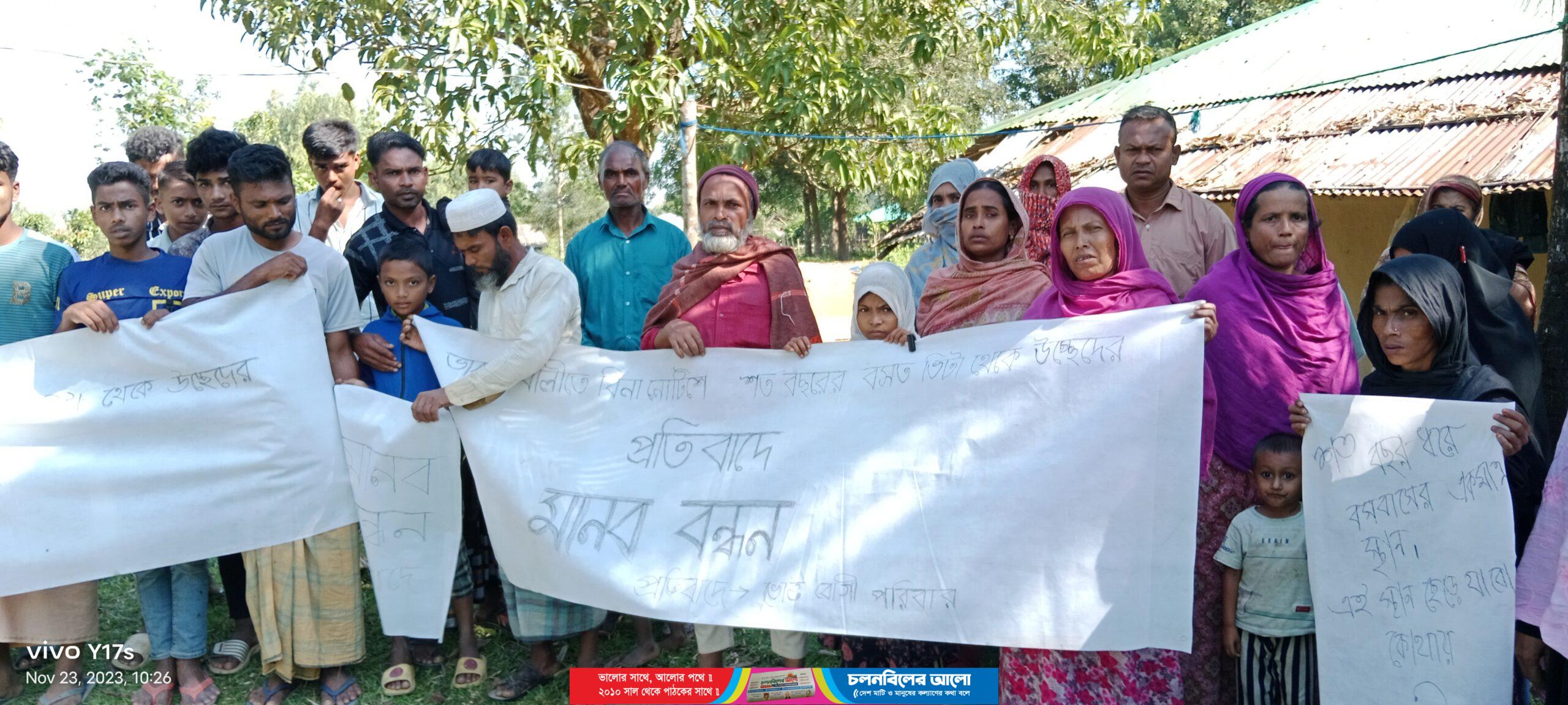 কক্সবাজার সদর উপজেলার ভারুয়াখালীতে বিনা নোটিশে শতবছর পূর্বে দখলীয় ভুমিহীনদের বসতবাড়ি বাড়ি উচ্ছেদ করে মুজিব বর্ষের ঘর নির্মাণ বন্ধের  দাবীতে মানববন্ধন করেছে ভুক্তভোগীরা। বৃহস্পতিবার (২৩ নভেম্বর) সকালে ভারুয়াখালী ঘোনা পাড়া শিয়াইল্লা মোরা এলাকায় এ মানববন্ধন অনুষ্ঠিত হয়। এতে স্থানীয় শতাধিক লোকজন উপস্থিত ছিলেন।