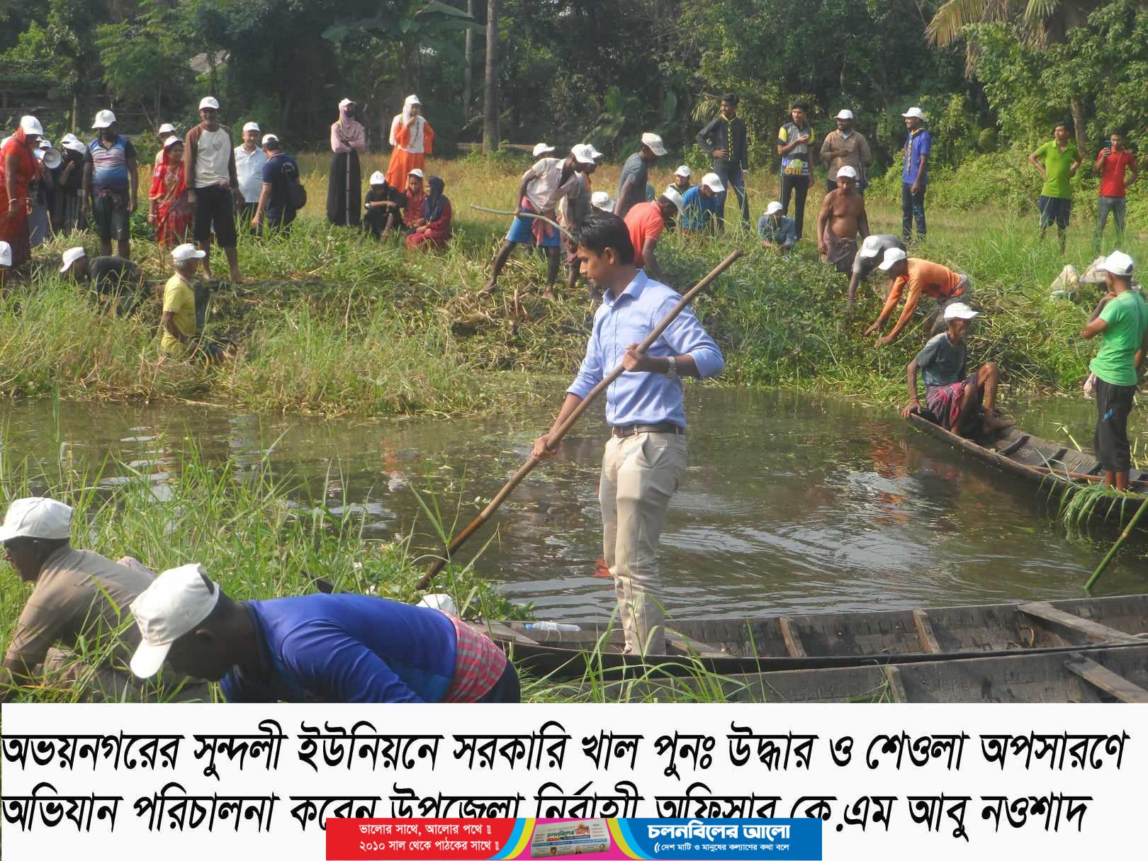 যশোরের অভয়নগর সুন্দলী ইউনিয়নে অভয়নগর উপজেলা প্রশাসনের উদ্যোগে জলাবদ্ধতা নিরসনে সরকারি খাল পুনঃ উদ্ধার ও শেওলা অপসারন অভিযান পরিচালনা করা হয়েছে। শনিবার ২৫ নভেম্বর সকাল থেকে উপজেলা নির্বাহী অফিসার কে.এম আবু নওশাদ’র নেতৃত্বে এঅভিযান করা হয়। এসময় তার সাথে ছিলেন উপজেলা সহকারী কমিশনার (ভূমি) থান্দার কামরুজ্জামান, উপজেলা নির্বাহী অফিসার কে.এম আবু নওশাদের সহধর্মীনি নাহিদা সুলতানা, নওয়াপাড়া প্রেসক্লাবের সভাপতি নজরুল ইসলাম মল্লিক, ও যুগ্ম সম্পাদক সৈয়দ মাসুদ তাজ, যশোর জেলা ত্রাণ ও পুনর্বাসন কর্মকর্তা রিজিবুল ইসলাম, উপজেলা কৃষি কর্মকর্তা লাভলী খাতুন, পিআইও মোঃ মুসফিকুর রহমান, যুব উন্নয়ন অফিসার আঞ্জুয়ারা বেগম, পল্লী দারিদ্র বিমোচন কর্মকর্তা হারুনর রশিদ, সহকারি প্রোগ্রামার আহসান কবির,নওয়াপাড়া সরকারী কলেজ অধ্যক্ষ রবিউল হাসান ও তার সেচ্ছাসেবক দল, সুন্দলী এস.টি স্কুল এন্ড কলেজ অধ্যক্ষ আব্দুল লতিফ, সুন্দলী ইউনিয়ন পরিষদ চেয়ারম্যান বিকাশ রায় (কপিল), সুন্দলী ইউনিয়ন কৃষকলীগ সাধারণ সম্পাদক অমর বিশ্বাস ও সাংগঠনিক সম্পাদক অলোক কুমার দাস, যুবলীগ সাধারণ সম্পাদক পল্লব বিশ্বাস, সহ সুন্দলী ইউনিয়ন সেচ্ছাসেবক দল।