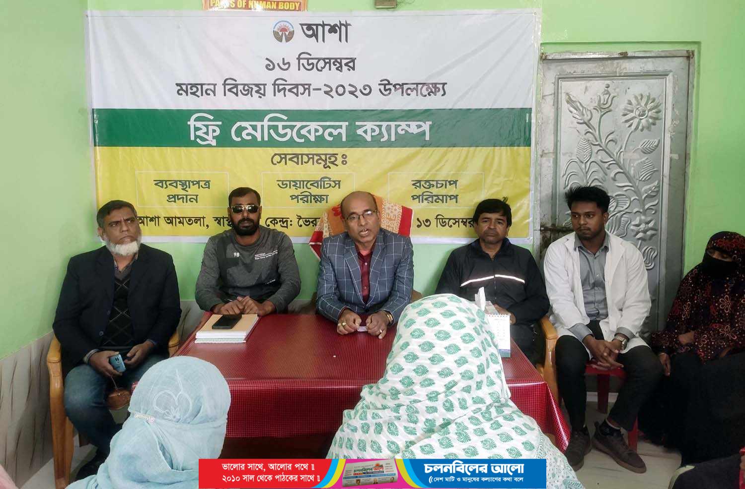 যশোরের অভয়নগরে মহান বিজয় দিবস উপলক্ষ্যে দিনব্যাপী ফ্রি মেডিকেল ক্যাম্প অনুষ্ঠিত হয়েছে। বুধবার (১৩ ডিসেম্বর) সকাল থেকে বিকাল পর্যন্ত উপজেলার সিদ্ধিপাশা ভৈরব আদর্শ মহাবিদ্যালের সামনে আশা আমতলা স্বাস্থ্যসেবা কেন্দ্রের উদ্যোগে এ কর্মসূচির আয়োজন করা হয়। এদিন প্রায় দুই শতাধিক দরিদ্র সাধারণ রোগী ফ্রি চিকিৎসা গ্রহণ করেন। ফ্রি মেডিকেল ক্যাম্পের উদ্ভোধন অনুষ্ঠানে উপস্থিত ছিলেন, আশা নওয়াপাড়া অঞ্চলের আরএম প্রশান্ত চাকি, আশা আমতলা স্বাস্থ্যসেবার ইনচার্জ কাঞ্চন বিশ্বাস, ভৈরব আদর্শ মহাবিদ্যালয়ের অধ্যক্ষ পিজুষ কান্তি হীরা, ইউপি সদস্য মো. বাবুল সরদার, আশা আমতলা ব্রাঞ্চ ম্যানেজার রফিকুল ইসলাম, স্বাস্থ্য সেবিকা শারমিন সুলতানা, সুমি খাতুন, নূরজাহান খাতুন প্রমূখ। ফ্রি মেডিকেল ক্যাম্পে আগত রোগীদের, ব্যবস্থাপত্র প্রদান, ডায়াবেটিস পরীক্ষা ও রক্তচাপ পরিমাপ করা হয়।