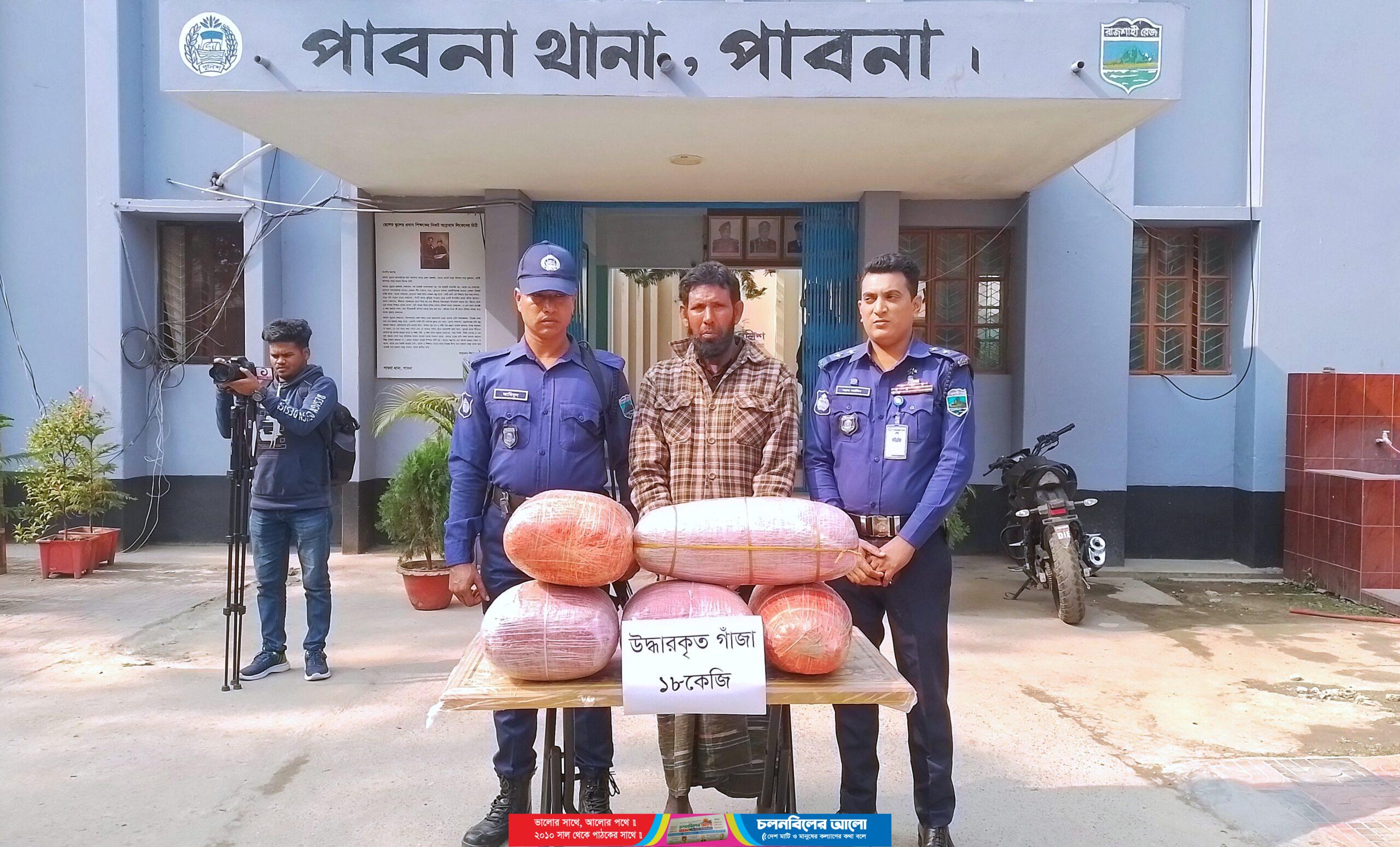 পাবনায় ১৮ কেজি গাঁজাসহ মাদক ব্যবসায়ীকে আটক করেছে পুলিশ। সোমবার গভীর রাতে গোপন সংবাদের ভিত্তিতে ধোপাঘাটা পশ্চিমপাড়ায় অভিযান চালিয়ে ১৮ কেজি গাঁজাসহ মাদক কারবারিকে আটক করে পাবনা সদর থানা পুলিশ। আটককৃত ব্যক্তি হলেন, ধোপাঘাটা এলাকার মো. সাত্তার শেখের ছেলে মো. মাজেদ শেখ (৪২)।