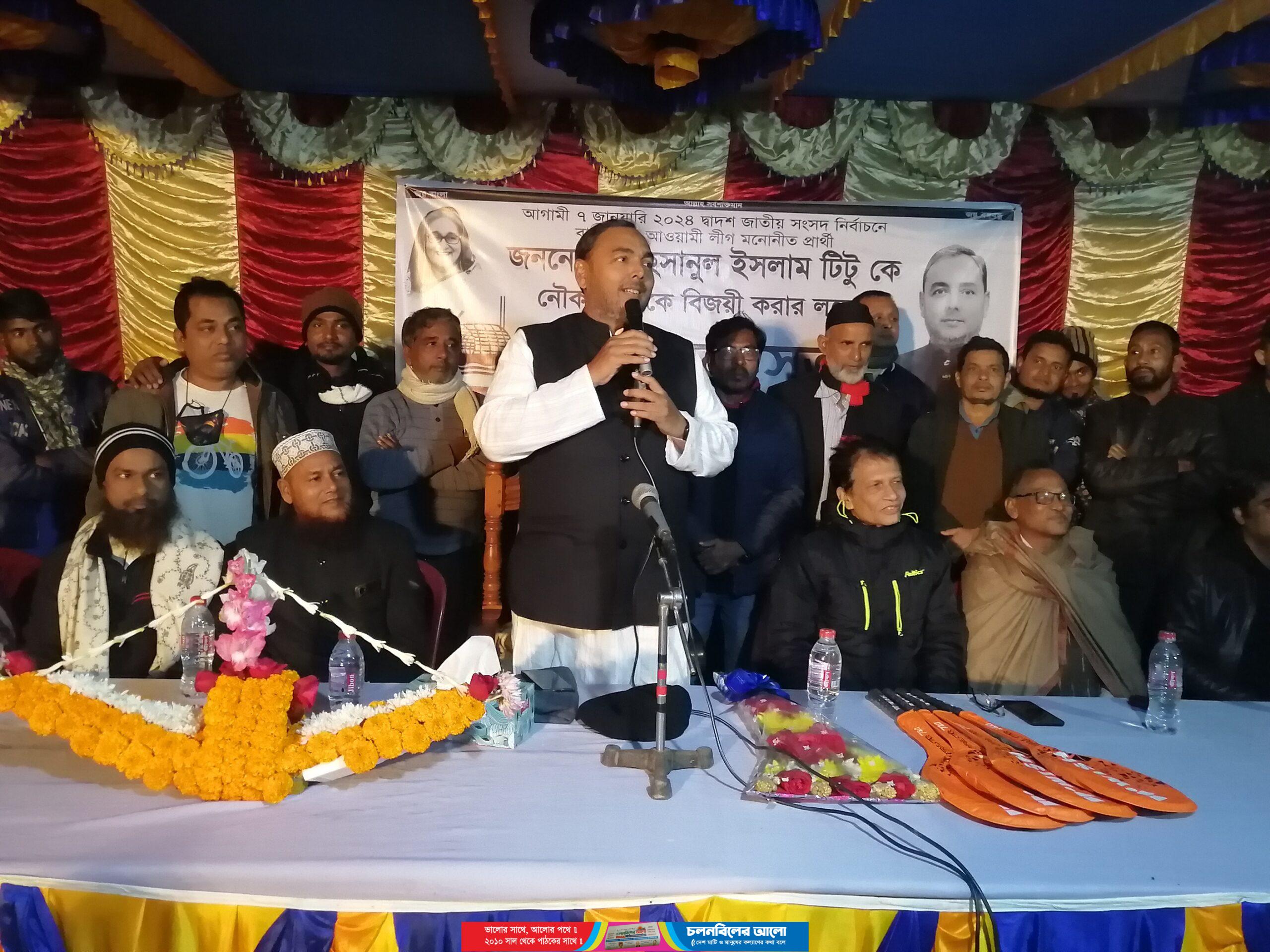 আসন্ন দ্বাদশ জাতীয় সংসদ নির্বাচনে টাঙ্গাইল-৬ (নাগরপুর-দেলদুয়ার) আসনে আওয়ামীলীগ মনোনীত প্রার্থী আহসানুল ইসলাম টিটু এমপি নির্বাচনী আলোচনা সভায় বলেন, মা বোনদের স্বতস্ফ‚র্ত অংশগ্রহণই প্রমাণ করে নৌকার পালে হাওয়া লেগেছে। এলাকার ধারাবাহিক উন্নয়নের স্বার্থে আজ নাগরপুর-দেলদুয়ারের মা বোনেরা ঐক্যবদ্ধ হয়ে নৌকাকে বিজয়ী করতে মাঠে নেমেছে। তিনি আরো বলেন, নির্বাচন কতটা উৎসব মূখর পরিবেশে হচ্ছে রাতের বেলা এই প্রচন্ড শীত উপেক্ষা করে এ নির্বাচনী সভায় আপনাদের এ উপস্থিতিই তা প্রমাণ করে। শনিবার (২৩ ডিসেম্বর) রাতে টাঙ্গাইলের নাগরপুর উপজেলা সদরের দক্ষিণ বাবনাপাড়া গ্রামবাসীর উদ্যোগে আয়োজিত এক নির্বাচনী সভায় তিনি এসব কথা বলেন। তিনি এসময় বিগত সময়ে নাগরপুরের বিভিন উন্নয়ন কর্মকান্ডের চিত্র তুলে ধরেন এবং তার অসমাপ্ত কাজগুলো এগিয়ে নিতে আবারো নৌকায় ভোট দিয়ে তাকে বিজয়ী করার জন্য উপস্থিত সকলের প্রতি আহবান জানান। বাংলাদেশ পূজা উদযাপন পরিষদ নাগরপুর উপজেলা শাখার সভাপতি স্বপন কুমার সাহার সভাপতিত্বে অনুষ্ঠিত নির্বাচনী সভায় আরো উপস্থিত ছিলেন, উপজেলা আওয়ামীলীগের ত্রাণ ও সমাজ কল্যাণ বিষয়ক সম্পাদক উজ্জ্বল হোসেন মোল্লা, বিজ্ঞান ও প্রযুক্তি বিষয়ক সম্পাদক জাকির হোসেন তালুকদার, মহিলা আওয়ামীলীগের সভানেত্রী জাহানারা আক্তার প্রমূখ। এসময় আওয়ামী লীগের বিভিন্নস্তরের নেতাকর্মীরা উপস্থিত ছিলেন।