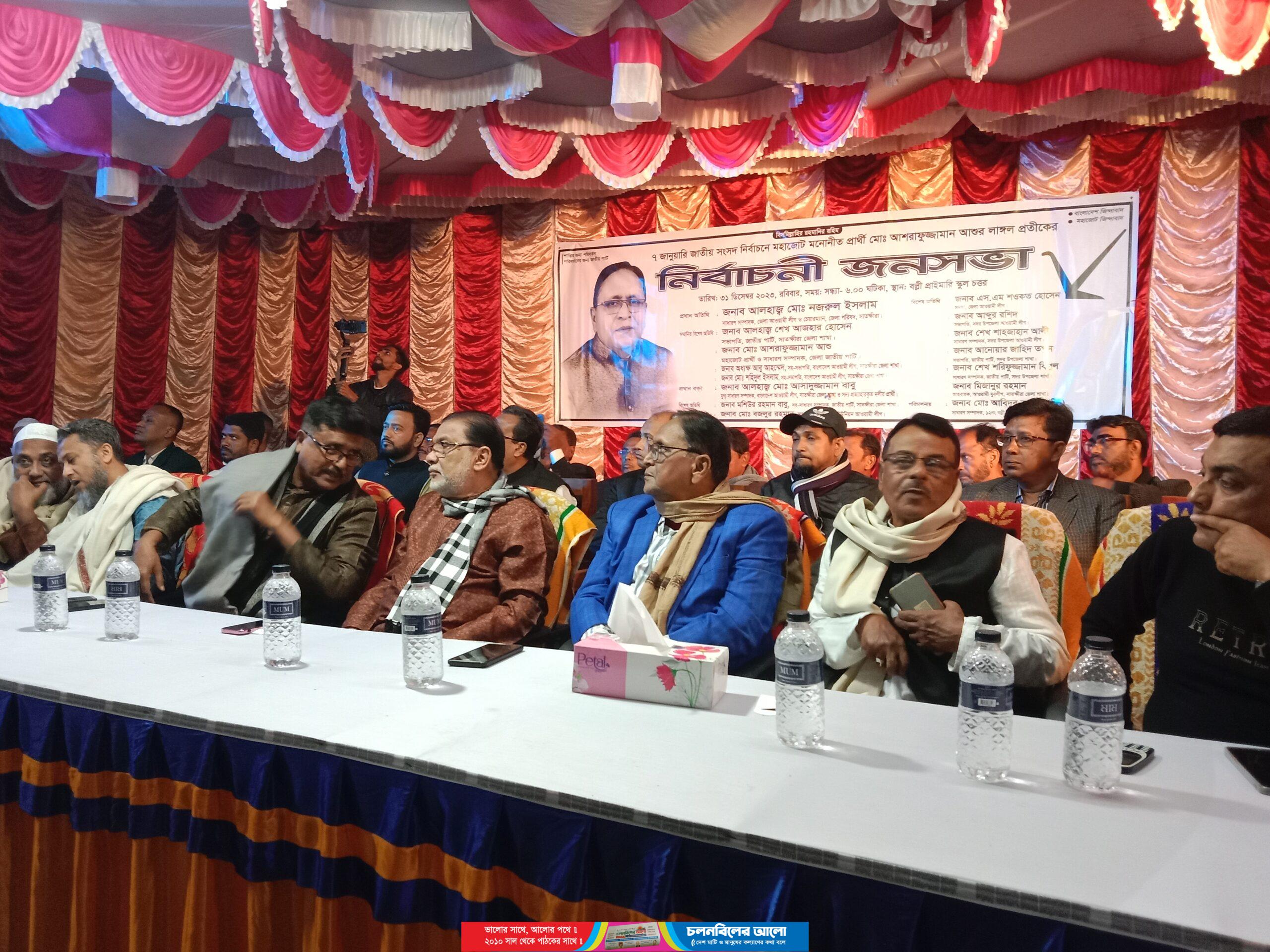 জননেত্রী শেখ হাসিনা দেশের রাজনৈতিক পরিস্থিতি উত্তরণে সাতক্ষীরা সদর দুই আসনে জোটের অন্যতম শরিক দল জাতীয় পার্টি থেকে মনোনয়ন প্রাপ্ত মহাজোটের প্রার্থী আশরাফুজ্জামান আশু কে লাঙল প্রতীকে ভোট দিয়ে নির্বাচিত করে জননেত্রী শেখ হাসিনার হাতকে শক্তিশালী করার আহ্বান জানান তিনি। জনসভার সভাপতিত্ব করেন, বল্লী ইউনিয়ন আওয়ামী লীগের সভাপতি ও সাবেক ইউপি চেয়ারম্যান বজলুর রহমান। অনুষ্ঠানে বিশেষ অতিথি হিসেবে বক্তব্য রাখেন জেলা আওয়ামীলীগের সহ-সভাপতি বীর মুক্তিযোদ্ধা অধ্যক্ষ আবু আহমেদ, সম্মানিত অতিথি হিসেবে বক্তব্য রাখেন মহাজোট মনোনীত প্রার্থী আশরাফুজ্জামান আশু, প্রধান বক্তা হিসেবে বক্তব্য রাখেন জেলা আওয়ামীলীগের যুগ্ম সাধারণ সম্পাদক সাবেক সদর উপজেলা পরিষদের সফল চেয়ারম্যান আলহাজ্ব মোঃ আসাদুজ্জামান বাবু,  বক্তব্য রাখেন সদর উপজেলা আওয়ামীলীগের সভাপতি শেখ আব্দুর রশিদ সাধারণ সম্পাদক মোঃ শাহজাহান আলী, বক্তব্য রাখেন উপজেলা জাতীয় পার্টির সভাপতি আনোয়ার জাহিদ তপন, সাংগঠনিক সম্পাদক আকরাম হোসেন বাপ্পী, বক্তব্য রাখেন জেলা যুবলীগের আহ্বায়ক মিজানুর রহমান মিজান, সদর যুবলীগের সাধারণ সম্পাদক প্রভাষক মইনুল ইসলাম, এসময় উপস্থিত ছিলেন জেলা আওয়ামীলীগের সহ-সভাপতি বীর মুক্তিযোদ্ধা শহীদুল ইসলাম, দপ্তর সম্পাদক শেখ হারুনুর রশিদ, বঙ্গবন্ধু সৈনিক লীগের জেলা সভাপতি মাহমুদ আলী সুমন, সাধারণ সম্পাদক এড তৌহিদুর রহমান শাহীন, সদর, সদর জাতীয় পার্টির সাধারণ সম্পাদক শেখ শরিফুজ্জামান বিপুল,ইউনিয়ন জাতীয় পার্টির ভারপ্রাপ্ত সভাপতি আতারুল ইসলাম, সাধারণ সম্পাদক মাষ্টার আবেদূর রহমান টিটু , রায়পুর মাধ্যমিক বিদ্যালয়ের প্রধান শিক্ষক মোঃ মিজানুর রহমান,বল্লী আদর্শ বালিকা বিদ্যালয়ের প্রধান শিক্ষক মুনছুর আলী, সদর যুবলীগের ভারপ্রাপ্ত সভাপতি জাহিদ হোসেন, ইউনিয়ন যুবলীগের সাবেক সভাপতি শেখ আজহারুল ইসলাম সহ বিভিন্ন ওয়ার্ড থেকে আগত আওয়ামীলীগ, জাতীয় পার্টি সহ বিভিন্ন অঙ্গ সহযোগী সংগঠনের শত শত নেতাকর্মী বৃন্দ সমগ্র অনুষ্ঠান পরিচালনা করেন ইউনিয়ন যুবলীগের আহ্বায়ক আবতাবুজ্জামান লাল্টু।