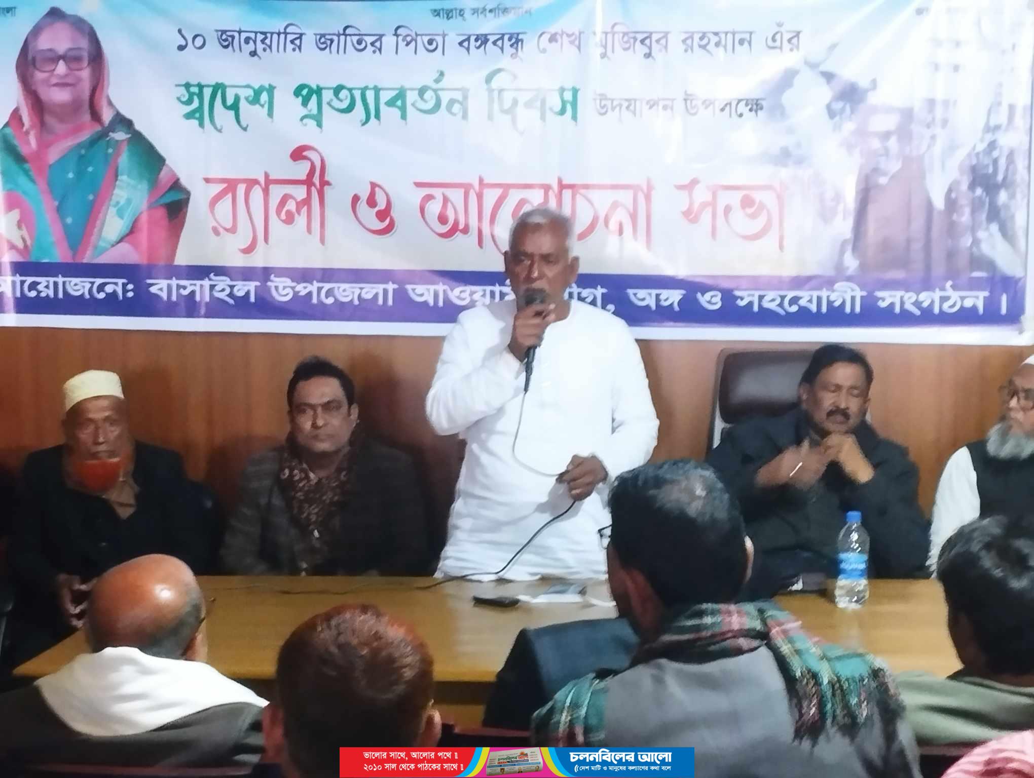 টাঙ্গাইলের বাসাইলে বঙ্গবন্ধুর স্বদেশ প্রত্যাবর্তন দিবস উপলক্ষে শোভাযাত্রা ও আলোচনা সভা অনুষ্ঠিত হয়েছে। বুধবার বেলা ১১ টায় বাসাইল উপজেলা আওয়ামীলীগ,অঙ্গ ও সহযোগী সংগঠনের উদ্যোগে একটি র্যালি পৌর শহরের প্রধান প্রধান সড়ক প্রদক্ষিণ করে। পরে উপজেলা আওয়ামীলীগ কার্যালয়ে উপজেলা আওয়ামী লীগের সভাপতি হাজী মতিউর রহমান গাউসের সভাপতিত্বে ও সিনিয়র যুগ্ম-সাধারন সম্পাদক সোহানুর রহমান সোহেল এর সঞ্চনালয় বক্তব্য রাখেন এবং উপস্থিত ছিলেন বাসাইল পৌরসভার সাবেক মেয়র আব্দুর রহিম আহমেদ,বাসাইল উপজেলা পরিষদের ভাইস চেয়ারম্যান শাহাদাত হোসেন, ধর্ম বিষয়ক সম্পাদক জহির আহমেদ পিন্টু,সাংগঠনিক সম্পাদক খায়রুল ইসলাম তালহা,নূরে আলাম নিরান, পৌর আওয়ামীলীগের সভাপতি জাহাঙ্গীর হোসেন,বিভিন্ন ইউনিয়ন আওয়ামীলীগের সভাপতি ও সম্পাদকবৃন্দ,উপজেলা শ্রমিকলীগের আহ্বায়ক পৌর কাউন্সিলর প্রিন্স মাহমুদ, উপজেলা তাতীলীগের সভাপতি বদিউজ্জামান বিদ্যুৎ,