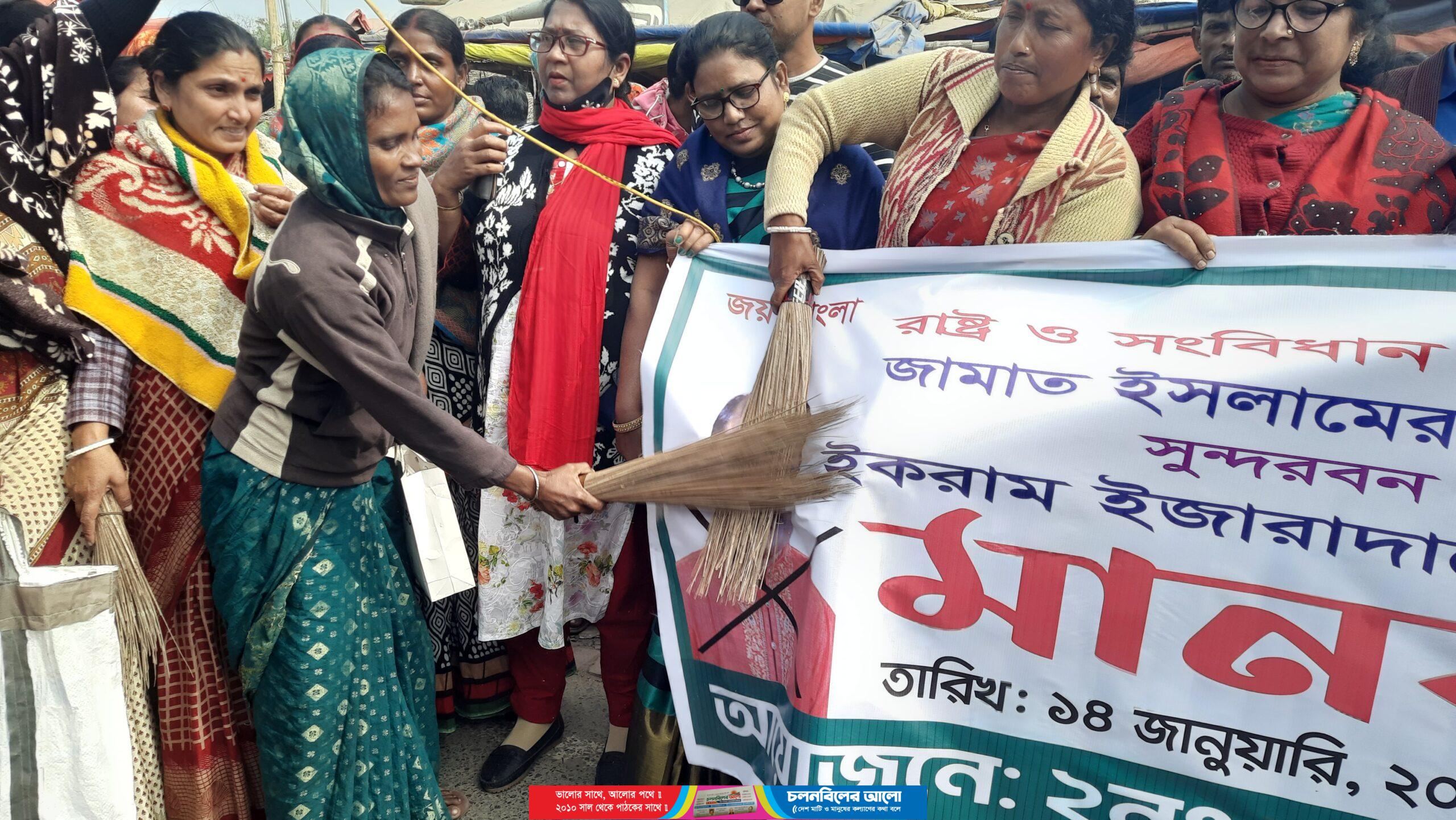 ‘নারী নেতৃত্ব হারাম’ বলে বক্তব্য দেয়া মোংলার সেই ইউপি চেয়ারম্যানের অপসারণসহ বিচারের দাবীতে ঝাড়ু মিছিল ও মানববন্ধন করেছেন কয়েক’শ হিন্দু, খ্রিস্টান ও মুসলিম নারীরা। উপজেলার সুন্দরবন ইউপি চেয়ারম্যান ইকরাম ইজারদারের নারী নেতৃত্ব হারাম বলে দেয়া বক্তব্যের প্রতিবাদে ও তার বিরুদ্ধে ব্যবস্থা গ্রহণের দাবীতে রবিবার বেলা সাড়ে ১১টায় মোংলা-খুলনা মহাসড়কের দিগরাজে এ কর্মসূচী পালন করেন বুড়িরডাঙ্গা ইউনিয়ন নারী সমাজ। মানববন্ধনে ঝাড়ু হাতে নিয়ে অংশগ্রহণকারীরা পরে মহাসড়ক অবরোধ করে ঝাড়ু মিছিল ও বিক্ষোভ প্রদর্শন করেন।