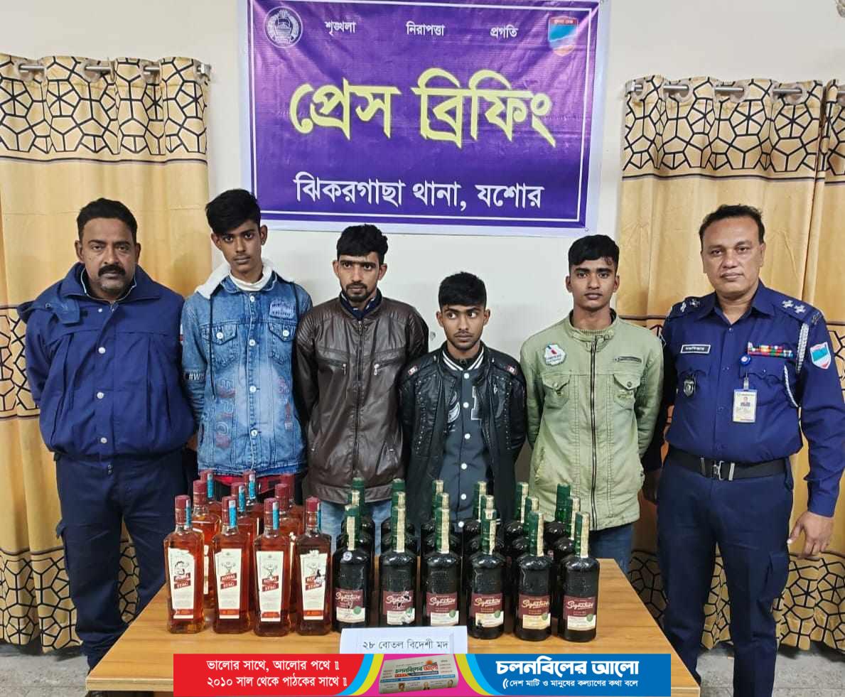 যশোরের ঝিকরগাছা থানা পুলিশের অভিযানে ২৮ বোতল বিদেশী মদসহ ৪ মাদক ব্যবসায়ী কে আটক করেছে পুলিশ।