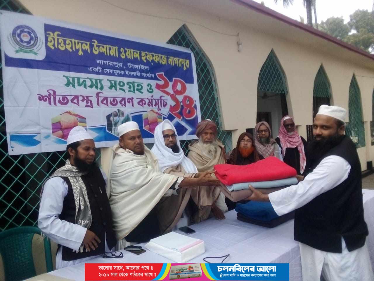 শনিবার(২০ জানুয়ারী)সকালে নাগরপুর সরকারি কলেজ জামে মসজিদ এ-র সামনে অত্র সংগঠনের সভাপতি মুফতী জহিরুল ইসলামের সভাপতিত্ব ও মুফতী শহিদুল ইসলাম সিরাজীর পরিচালনায় অত্র সংগঠনের উপজেলা ও ইউনিয়নের বিভিন্ন পর্যায়ের দায়িত্বশীলের উপস্থিতিতে শীতবস্ত্র হিসাবে কম্বল বিতরণ করা হয়।