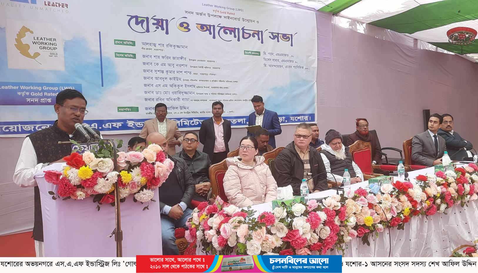সকলের ঐক্যবদ্ধ প্রচেষ্টায় কঠিন থেকে কঠিনতম পুরষ্কার অর্জন করা সম্ভব। তাই কোনো কিছু অর্জন করা যেমন কঠিন, তা ধরে রাখা আরও কঠিন। লেদার ওয়ার্কিং গ্রুপ (এলডব্লিউজি) কর্তৃক এস.এ.এফ ইন্ডাস্ট্রিজ লিমিটেড গোল্ড রেটেড সনদ অর্জন উপলক্ষে সাইনবোর্ড উন্মোচন, দোয়া ও আলোচনা সভায় এ কথা বলেন, এস এ এফ ইন্ডাস্ট্রিজ লিমিটেডের ব্যবস্থাপনা পরিচালক ও যশোর-১ আসনের জাতীয় সংসদ সদস্য শেখ আফিল উদ্দিন। তিনি আরও বলেন, এ অর্জন প্রতিষ্ঠানের সকলের। তাদের ঐকান্তিক প্রচেষ্টায় গোল্ড রেটেড সনদ অর্জন করা সম্ভব হয়েছে। তবে এ অর্জনের ধারা যেনো অব্যাহত থাকে সেই আহবানের পাশাপাশি প্রতিষ্ঠানের সকল কর্মকর্তা-কর্মচারী ও শ্রমিকদের এক মাসের অতিরিক্ত বেতন প্রদানেরও ঘোষণা করেন তিনি।যশোরের অভয়নগরে এস.এ.এফ ইন্ডাস্ট্রিজ লিমিটেডের আয়োজনে গতকাল সোমবার দুপুরে অনুষ্ঠিত সাইনবোর্ড উন্মোচন, দোয়া ও আলোচনা সভা প্রতিষ্ঠানের ভেতরে অনুষ্ঠিত হয়। এতে সভাপতিত্ব করেন, এস এ এফ ইন্ডাস্ট্রিজ লিমিটেডের ব্যবস্থাপনা পরিচালক ও যশোর-১ আসনের জাতীয় সংসদ সদস্য শেখ আফিল উদ্দিন। প্রধান অতিথি হিসেবে উপস্থিত ছিলেন, নওয়াপাড়া পীরবাড়ির গদ্দিনশীন পীর আলহাজ্ব খাজা শাহ্ রফিকুজ্জামান। অনুষ্ঠানে বিদেশী মেহমান হিসেবে উপস্থিত ছিলেন, সুদূর চীন থেকে আগত মি. গ্যান (এমএমজেড), মিসেস সামার (এমএমজেড) ও হংকং থেকে আগত মি. আনন্দমোহন (এরান প্যাসিফিক)। বিশেষ অতিথি হিসেবে উপস্থিত ছিলেন, অভয়নগর উপজেলা নির্বাহী কর্মকর্তা কে এম আবু নওশাদ, নওয়াপাড়া পৌরসভার মেয়র সুশান্ত কুমার দাস শান্ত, যশোরের কলকারখানা ও প্রতিষ্ঠান পরিদর্শন অধিদপ্তরের উপমহা-পরিদর্শক আবদুল কাইউম, অভয়নগর থানার ভারপ্রাপ্ত কর্মকর্তা (ওসি) এস এম আকিকুল ইসলাম, উপজেলা স্বাস্থ্য ও পরিবার পরিকল্পনা কর্মকর্তা ডা. ওয়াহিদুজ্জামান, বাংলাদেশ সড়ক পরিবহন শ্রমিক ফেডারেশন কেন্দ্রীয় কমিটির সহ-সাধারণ সম্পাদক রবিন অধিকারী ব্যাচা, নওয়াপাড়া প্রেসক্লাবের সভাপতি নজরুল ইসলাম মল্লিক, দৈনিক স্পন্দনের নির্বাহী সম্পাদক মাহাবুব আলম লাভলু। সাইনবোর্ড উন্মোচন ও আলোচনা সভা শেষে দোয়া পরিচালনা করেন, অনুষ্ঠানের প্রধান অতিথি নওয়াপাড়া পীরবাড়ির গদ্দিনশীন পীর আলহাজ্ব খাজা শাহ্ রফিকুজ্জামান। পরে মধ্যাহ্নভোজের মধ্যদিয়ে অনুষ্ঠানের সমাপ্তি ঘটে।