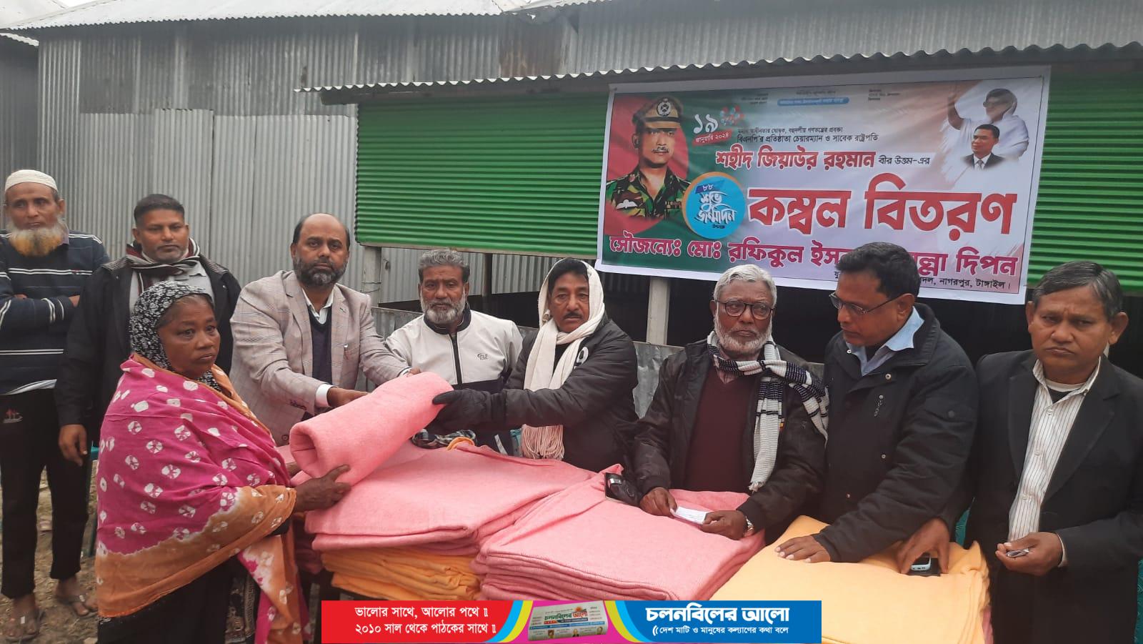 টাঙ্গাইলের নাগরপুরে শহীদ প্রেসিডেন্ট জিয়াউর রহমানের ৮৮ তম জন্মবার্ষিকী উপলক্ষে নাগরপুর উপজেলা যুবদলের নেতা মো. রফিকুল ইসলাম মোল্লা দিপন এর সার্বিক সহযোগিতায় শীতার্থের মাঝে কম্বল বিতরণ করা হয়েছে । বুধবার বিকালে সহবতপুর বছির একাডেমিক কিন্ডার গার্ডেন প্রঙ্গণে এ কম্বল বিতরণ করা হয়। সহবতপুর ইউনিয়ন বিএনপি’র সভাপতি মো. আলাল উদ্দিন আলালের সভাপতিত্বে প্রধান অতিথি হিসেবে উপস্থিত ছিলেন, নাগরপুর উপজেলা বিএনপি’র সভাপতি বীর মুক্তিযোদ্ধা এম এ ছালাম। আরো উপস্থিত ছিলেন, উপজেলা বিএনপি’র সিনিয়ন সহ-সভাপতি মো. আহম্মদ আলী রানা, নাগরপুর উপজেলা বিএনপি’র সাবেক সাধারণ সম্পাদক মো. সেলিম মিয়া, মো. হাবিবুর রহমান হাবিব, যুবদল নেতা মো. মামুন মিয়া, সহবতপুর বাজার বনিক সমিতির সাধারণ সম্পাদক আবুল হোসেন, সহবতপুর ইউনিয়ন শ্রমিক দলের সাধারণ সম্পাদক মো. নুরু সিকদারসহ ইউনিয়ন বিএনপি ও অঙ্গ সংগঠনের নেতৃবৃন্দরা ।