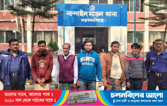 ময়মনসিংহ জেলা পুলিশ সুপার ও অতিরিক্ত পুলিশ সুপার গৌরীপুর সার্কেলের দিকনির্দেশনায় নান্দাইল মডেল থানা পুলিশ শনিবার (২৭ জানুয়ারি) দিবাগত রাতে বিশেষ অভিযান পরিচালনা করে আমোদপুর গ্রামের মৃত লাল চান মিয়ার পুত্র মিলন মিয়া, মৃত নুর ইসলামের পুত্র আব্দুল কাদির, কপালহর গ্রামের আবু সিদ্দিকের পুত্র আবু এমরান উরফে নন্দন, মৃত মছরফ আলীর পুত্র ফখরুল ইসলাম জুয়া আইনের ৪ ধারায় ৪ জনকে গ্রেফতার করা হয়েছে এবং জিআর ওয়ারেন্টভূক্ত আসামি জাহাঙ্গীরপুর গ্রামের মৃত আ: বারিকের পুত্র আশরাফুল ইসলাম উরফে মানিক সহ মোট ০৫ জন আসামি গ্রেফতার করে জেল হাজতে প্রেরণ করা হয়েছে।