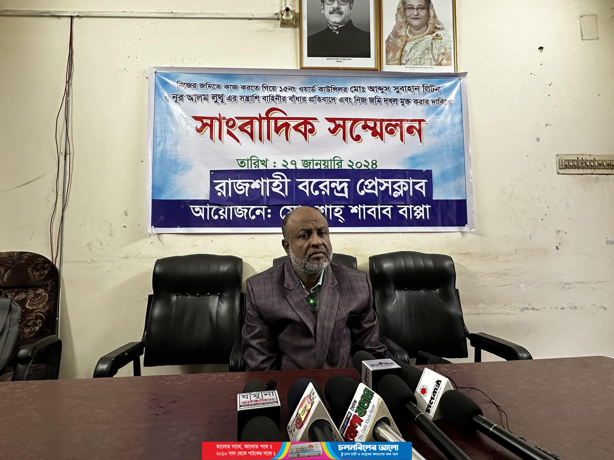 রাজশাহীতে নিজের জমিতে কাজ করতে গিয়ে রাসিকের ১৫ নং ওয়ার্ড কাউন্সিলর আব্দুস সুবাহান লিটন ও নূর আলম লুথু কর্তৃক সন্ত্রাসী বাহিনীর বাঁধা ও হামলার প্রতিবাদে এবং জমিটি দখলমুক্ত করার দাবিতে সংবাদ সম্মেলন করেছেন ভুক্তভোগী শাহ্ শাবাব বাপ্পা।