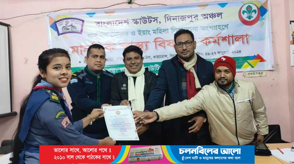 বাংলাদেশ স্কাউটসের গার্ল ইন স্কাউটিং বিভাগের পরিচালনায় মানসিক স্বাস্থ্য বিষয়ক কর্মশালা দশমাইলস্থ আঞ্চলিক স্কাউট প্রশিক্ষণ কেন্দ্রে অনুষ্ঠিত হয়েছে। গত ২৬ জানুয়ারি কর্মশালার উদ্বোধন করেন আঞ্চলিক স্কাউটসের কোষাধ্যক্ষ মোঃ মনজুরুল হক। এসময় দিনাজপুর আঞ্চলিক উপ পরিচালক মোঃ আব্দুর রশিদ, সহকারী পরিচালক মোঃ সৈকত হোসেন, কর্মশালার প্রশিক্ষক মোঃ সাইফুল ইসলাম ও মোঃ মাসহুরুল হক বক্তব্য রাখেন। ২৬-২৭ জানুয়ারি ২ দিনের কর্মশালায় মানসিক স্বাস্থ্য সম্পর্কিত প্রাথমিক ধারণাদান ও বিষন্নতা, উদ্বিগ্নতা, সেলফ হার্ম, সাইকোসিস ইত্যাদি বিষয়ে সেশন পরিচালনা করা হয়। সেশন পরিচালক হিসেবে দায়িত্ব পালন করেন ঢাকার টাইগার শার্ক ওপেন এয়ার স্কাউট গ্রুপের কোষাধ্যক্ষ মোঃ মাসহুরুল হক ও মুন্সিগঞ্জ জেলার রোভার স্কাউট লিডার প্রতিনিধি পিআরএস মোঃ সাইফুল ইসলাম। ২৭ জানুয়ারি সকালে সার্টিফিকেট বিতরণ করেন মোঃ আবু সাঈদ, সম্পাদক, দিনাজপুর অঞ্চল ও উপ পরিচালক মোঃ আব্দুর রশিদ। কর্মশালাটিতে দিনাজপুর, রংপুর, ঠাকুরগাঁও ও নীলফামারী জেলা থেকে ৩০ জন গার্ল ইন রোভার ও ইয়াং মহিলা লিডার অংশগ্রহণ করে।