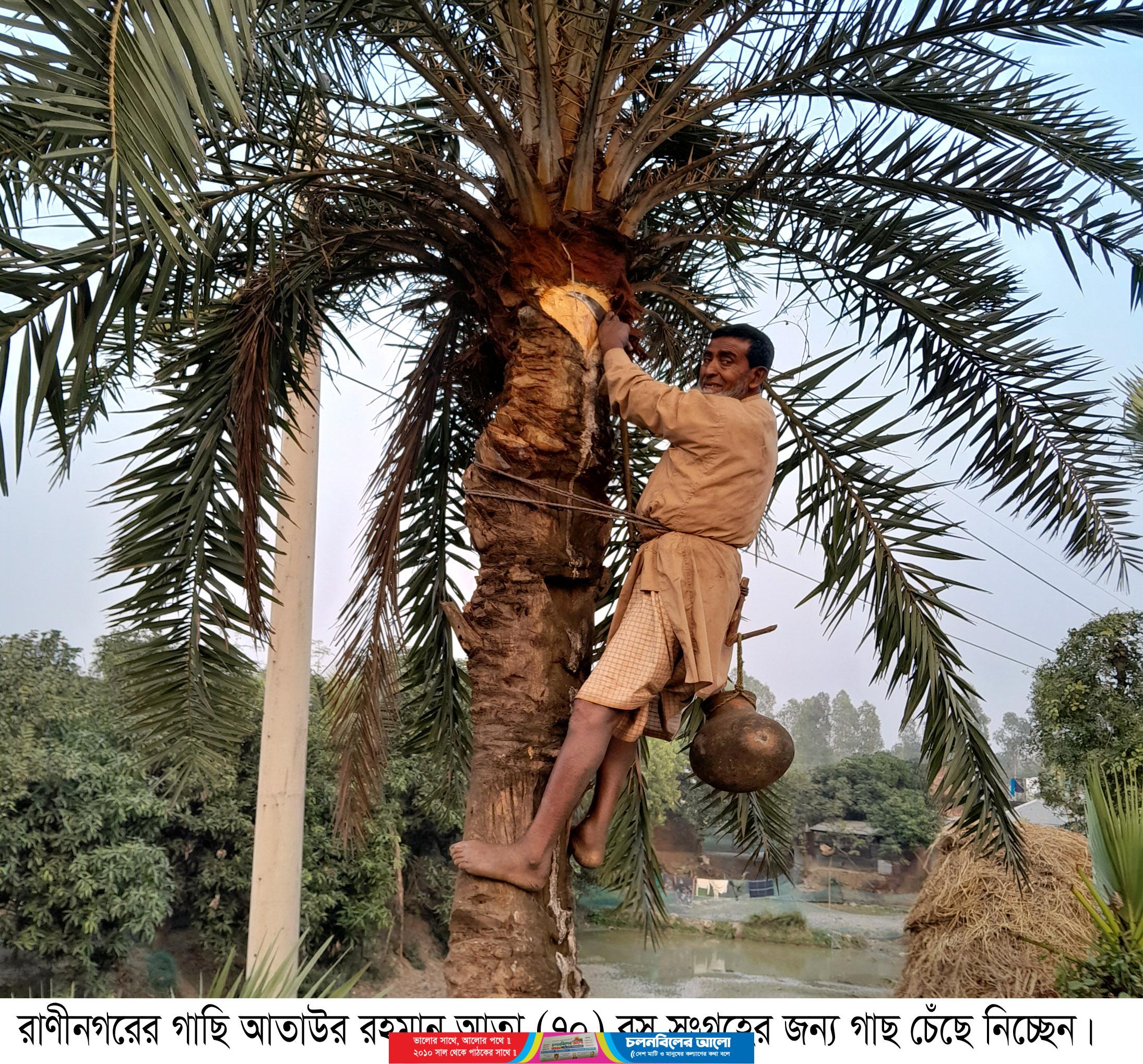 কোন পরিচর্চা ছাড়াই রাস্তা-ঘাট ও গোরস্থানে বেড়ে উঠা খেঁজুর গাছের রস সংগ্রহ করে লালি-গুড় তৈরি ও বিক্রি করে সংসার চলে নওগাঁর রাণীনগরের আতা এবং হাসুর।