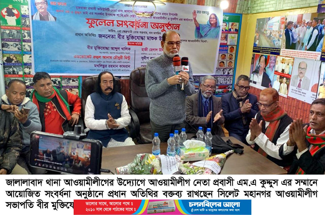 যুক্তরাজ্য প্রবাসী কমিউনিটি নেতা, জালালাবাদ থানা আওয়ামী লীগের উপদেষ্টা এম.এ কুদ্দুস এর সংবর্ধনা অনুষ্ঠান শুক্রবার (২ ফেব্রুয়ারী) রাত ৮টায় সিলেট মহানগরীর শাবিপ্রবি গেইট আখালিয়াঘাটে জালালাবাদ থানা আওয়ামীলীগের কার্যালয়ে অনুষ্ঠিত হয়েছে।