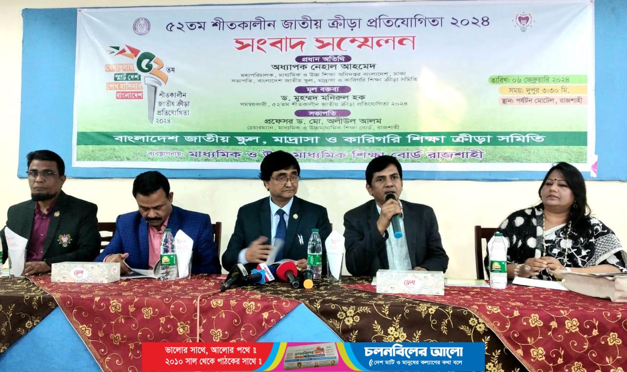 মঙ্গলবার (৬ ফেব্রুয়ারি) দুপুর সাড়ে ৩টায় রাজশাহী পর্যটন মোটেলে আয়োজিত সংবাদ সম্মেলনে মাধ্যমিক ও উচ্চ মাধ্যমিক শিক্ষা বোর্ড রাজশাহীর চেয়ারম্যান প্রফেসর ড. মো: অলীউল আলমের সভাপতিত্বে ৫২ তম শীতকালীন জাতীয় ক্রীড়া প্রতিযোগিতা-২৪’র সমন্বয়কারী ড. মুহম্মদ মনিরুল হক সাংবাদিকদের এসব তথ্য জানান।