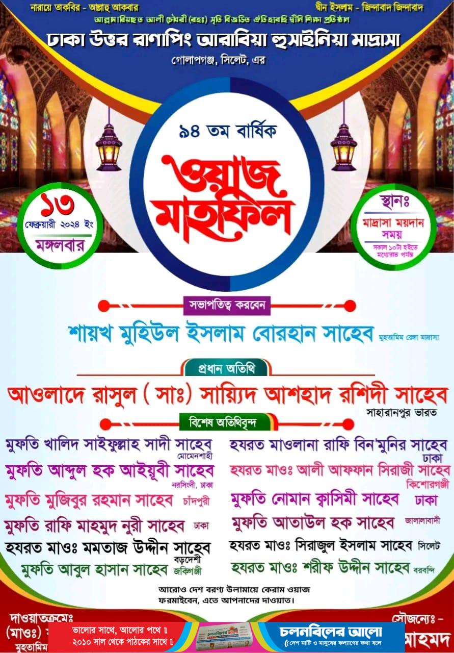 সিলেটের ঐতিহ্যবাহী ইসলামী বিদ্যাপীঠ ”ঢাকা উত্তর রানাপিং আরাবিয়া হুছাইনিয়া মাদ্রাসা,, রানাপিং, গোলাপগঞ্জের ৯৪’তম বার্ষিক ইসলামী মহাসম্মেলন মঙ্গলবার (১৩ ফেব্রুয়ারী) জামেয়ার মাঠ প্রাঙ্গনে সকাল ১০ ঘটিকা হইতে পরদিন ফজর পর্যন্ত আয়োজনের সকল প্রস্তুতি সম্পন্ন হয়েছে। আর মাত্র কয়েক ঘন্টার অপেক্ষা। রাত শেষ হলেই শুরু হবে জামেয়ার বহুল প্রতিক্ষিত ৯৪’তম বার্ষিক ইসলামী মহাসম্মেলন ২০২৪।