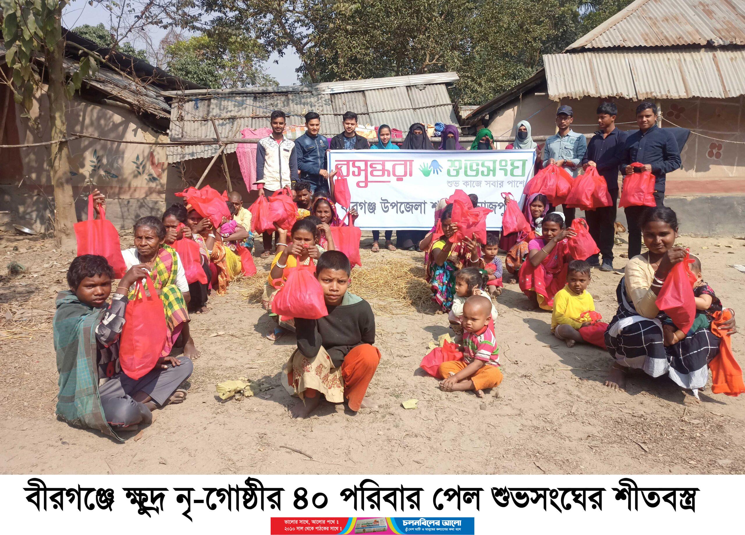 শীতের মৌসুম শেষের দিকে হলেও বৈরী আবহাওয়ায় উত্তরাঞ্চলের শীতের প্রভাব এখনো কাটেনি,যদিও বেলা বাড়ার সাথে সাথে দিনের বেলায় শীতের প্রকোপ কিছুটা কমলেও সন্ধ্যা থেকে ভোর পর্যন্ত শীতের তীব্রতা এই অঞ্চলে লক্ষ্য করা যাচ্ছে। তাই বসুন্ধরা শুভসংঘ বীরগঞ্জ উপজেলা শাখার আয়োজনে ১৩ ই ফেরুয়ারি মঙ্গলবার সকালে দিনাজপুর জেলার বীরগঞ্জ পৌরসভা ৯নং ওয়ার্ডের জগদল গ্রামের ক্ষুদ্র নৃ-গোষ্ঠীর ৪০ হত-দরিদ্র পরিবারের মাঝে  শীতবস্ত্র বিতরন করল শুভসংঘ।