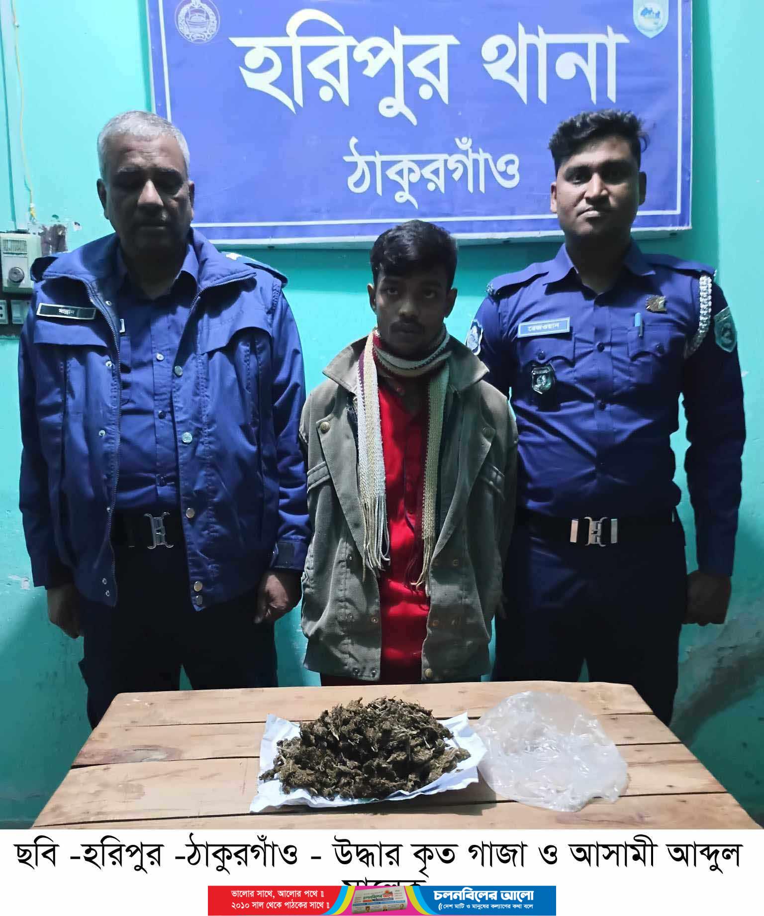 ঠাকুরগাঁয়ের হরিপুরে থানা পুলিশ মাদক বিরোধী অভিযান চালিয়ে ২শত ৫০ গ্রাম গাজা সহ আব্দুল মালেক (২৫) নামে এক মাদক কারবারিকে গ্রেফতার করে গতকাল মঙ্গলবার ঠাকুরগাঁওয়ে জেল হাজতে পাঠিয়েছেন। হরিপুর উপজেলা সদর ইউনিয়নের বাগানবাড়ির মৃত আব্দুল আজিজের ছেলে হরিপুর থানার অফিসার ইনচার্জ আব্দুল লতিফ বলেন হরিপুর থানা এসআই তাপস সহ সংঙ্গীয় পুলিশ নিয়ে সোমবার সন্ধ্যায় উপজেলা প্রসাশনের শিশুপার্ক এলাকার বাগান বাড়িতে আসামী আব্দুল মালেকের বাড়িতে অভিযান চালিয়ে তাকে গাজা সহ আটক করে থানায় নিয়ে আসা হয়। থানায় মাদক আইনে মামলা করে আসামী কে ঠাকুরগাঁও জেলহাজতে পাঠানো হয়েছে।