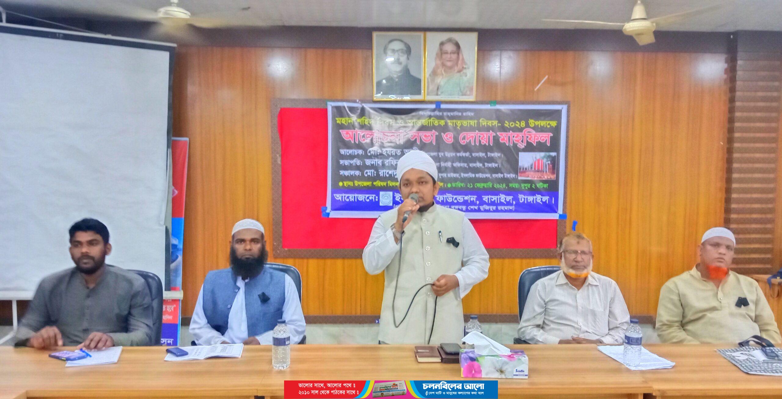 টাঙ্গাইলের বাসাইলে ইসলামিক ফাউণ্ডেশনের উদ্যোগে বাসাইল উপজেলা হল রুমে মহান শহীদ দিবস ও আন্তর্জাতিক মাতৃভাষা দিবস ২০২৪ উদযাপন উপলক্ষে আলোচনা সভা ও দোয়া মাহফিলের আয়োজন করা হয়েছে।