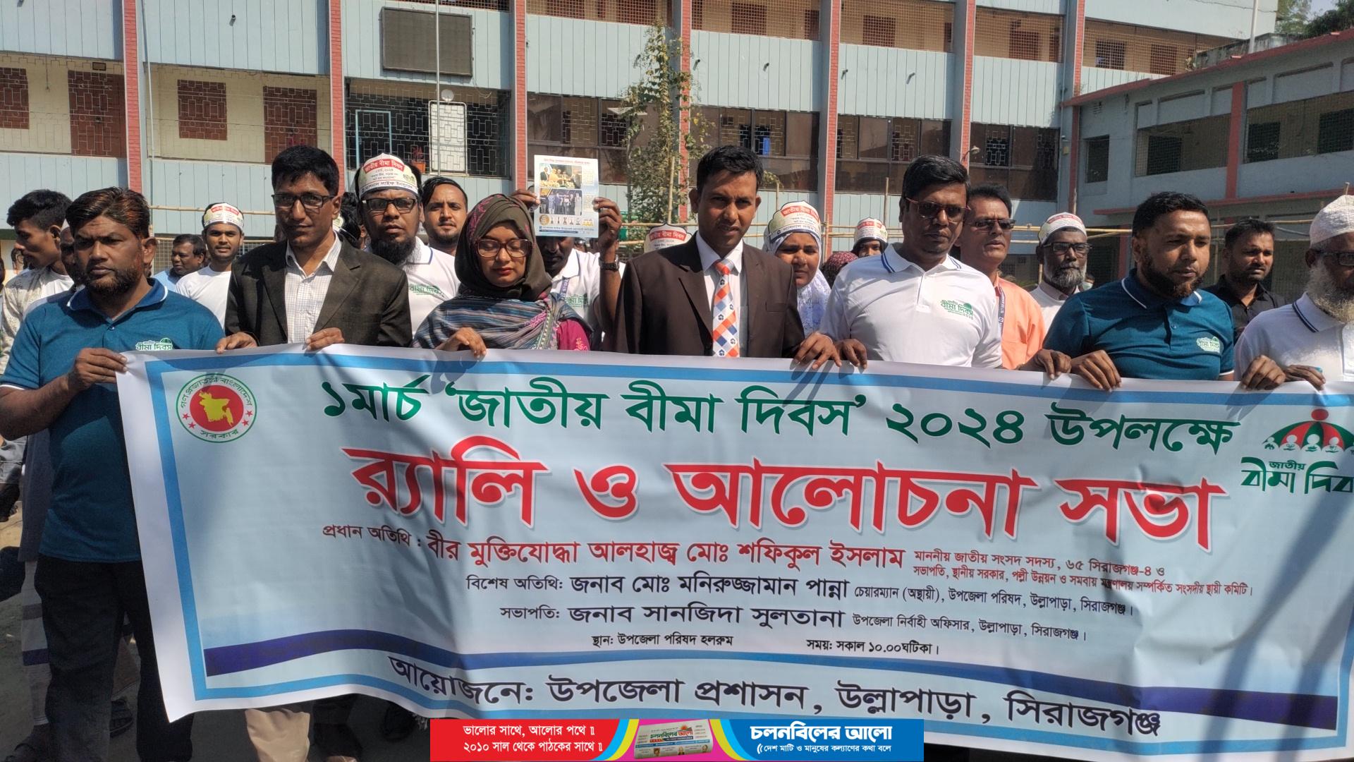 সিরাজগঞ্জের উল্লাপাড়ায় “বীমা সুরক্ষিত থাকলে এগিয়ে যাব সবাই মিলে ” এই শ্লোগানকে সামনে রেখে উল্লাপাড়ায় বীমা দিবস পালিত হয়েছে । বীমা দিবস উপলক্ষে উপজেলা প্রশাসনের নেতৃত্বে সন্ধানী লাইফ ইন্স্যুরেন্স কোম্পানীসহ ন্যাশনাল লাইফ ইন্স্যুরেন্স কোম্পানী, ডেল্টা লাইফ ইন্স্যুরেন্স কোম্পানী ও সাধারণ জীবন বীমা কর্পোরেশন যৌথ ভাবে একটি র্যালি বের করে । র্যালিটি পৌর শহরের প্রধান প্রধান সড়কগুলো প্রদক্ষিণ করে উপজেলা চত্ত্বরে এসে শেষে হয় । পরে উপজেলা পরিষদ হলরুমে উপজেলা প্রশাসন এর আয়োজনে বীমা দিবস উপলক্ষে উদ্বুদ্ধকরণ আলোচনা সভা অনুষ্ঠিত হয় । আলোচনা সভার সভাপতি উপজেলা নির্বাহী অফিসার সানজিদা সুলতানা এর সভাপতিত্বে স্থানীয় সরকার, পল্লী উন্নয়ন ও সমবায় মন্ত্রণালয় সম্পর্কিত সংসদীয় স্থায়ী কমিটির সভাপতি বীর মুক্তিযোদ্ধা আলহাজ্ব শফিকুল ইসলাম শফির দিক নির্দেশনায় উদ্বুদ্ধকরণ আলোচনা সভায় বক্তব্য রাখেন হাসান শাহরিয়ার এজিএম ইনচার্জ সন্ধানী লাইফ ইন্সুইরেন্স কোম্পানি, ন্যাশনাল লাইফ ইন্স্যুরেন্সের উল্লাপাড়া শাখার এরিয়া ম্যানেজার মোঃ আয়ুব আলী, উক্ত অনুষ্ঠানে আরো উপস্থিত ছিলেন উল্লাপাড়া উপজেলা সহকারী কমিশনার (ভুমি) মোছাঃ খাদিজা খাতুন, জীবন বীমা কর্পোরেশন হাটিকুমরুল শাখার ইনচার্জ মোঃ আব্দুল আজিজ