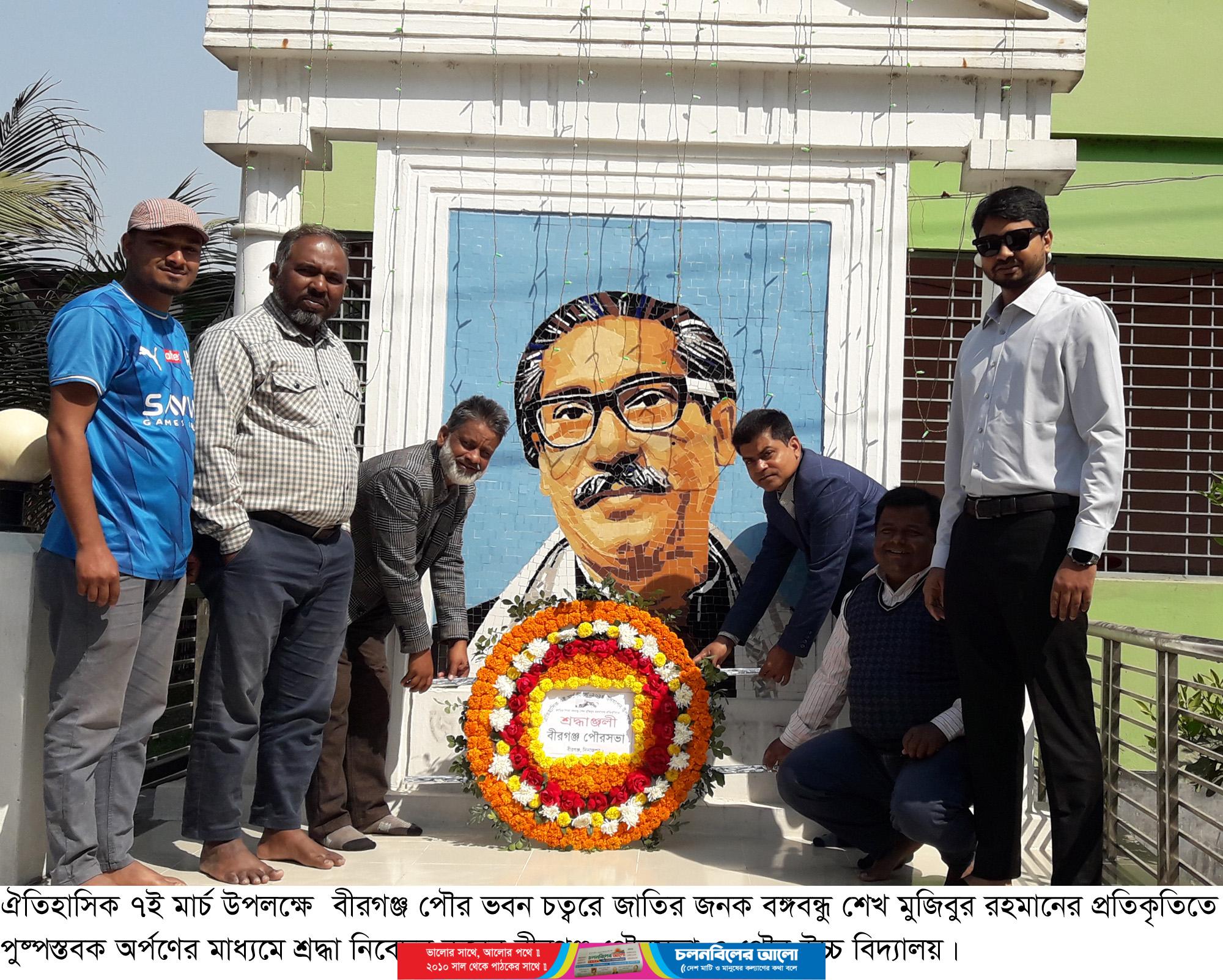 ঐতিহাসিক ৭ই মার্চ উপলক্ষে বীরগঞ্জ পৌর ভবন চত্বরে জাতির জনক বঙ্গবন্ধু শেখ মুজিবুর রহমানের প্রতিকৃতিতে পুষ্পস্তবক অর্পণের মাধ্যমে শ্রদ্ধা নিবেদন করেন বীরগঞ্জ পৌরসভা ও পৌর উচ্চ বিদ্যালয়।