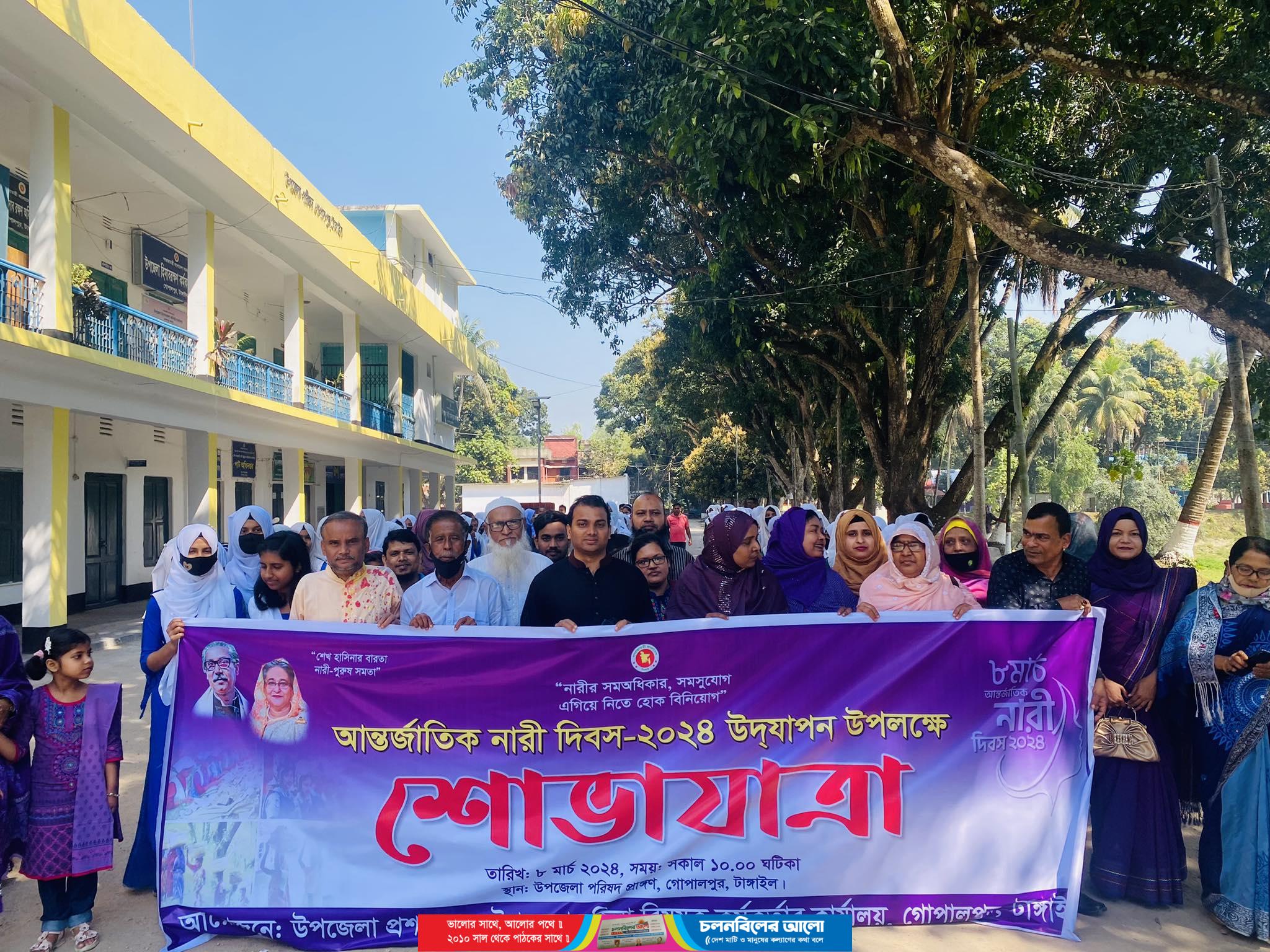 “নারীর সমঅধিকার,সমসুযোগ এগিয়ে নিতে হোক বিনিয়োগ” এই স্লোগানকে সামনে রেখে টাঙ্গাইলের গোপালপুরে আন্তর্জাতিক নারী দিবস উদযাপন উপলক্ষে শোভাযাত্রা ও আলোচনা সভা অনুষ্ঠিত হয়েছে।