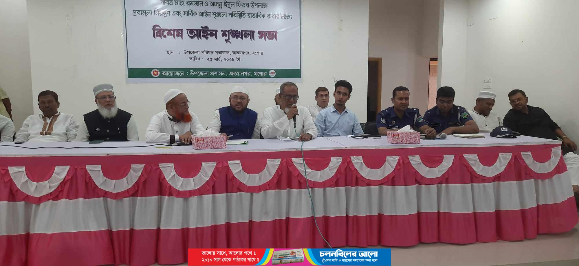 যশোরের অভয়নগরে পবিত্র মাহে রমজান ও আসন্ন ঈদুল ফিতর উপলক্ষে দ্রব্যমূল্য নিয়ন্ত্রণ ও সার্বিক আইন শৃঙ্খলা পরিস্থিতি স্বাভাবিক রাখার লক্ষ্যে বিশেষ আইন শৃঙ্খলা সভা অনুষ্ঠিত হয়েছে।গতকাল সোমবার দুপুরে উপজেলা প্রশাসনের আয়োজনে উপজেলা পরিষদ সভাকক্ষে এই বিশেষ সভা অনুষ্ঠিত হয়। উপজেলা নির্বাহী কর্মকর্তা কে এম আবু নওশাদ এর সভাপতিতে প্রধান অতিথি হিসেবে উপস্থিত ছিলেন, ৮৮ যশোর- ৪ আসনের মাননীয় সংসদ সদস্য এনামুল হক বাবুল। এ সময় উপস্থিত ছিলেন, উপস্থিত ছিলেন উপজেলা পরিষদের চেয়ারম্যান শাহ ফরিদ জাহাঙ্গীর,নওয়াপাড়া সরকারি মহাবিদ্যালয় এর অধ্যক্ষ রবিউল হাসান, অভয়নগর থানা ভারপ্রাপ্ত কর্মকর্তা (ওসি) এস এম আকিকুল ইসলাম, হাইওয়ে থানার (ওসি) মোহাম্মদ লিয়াকত হোসেন, উপজেলা আওয়ামী লীগের সাধারণ সম্পাদক সরদার অলিয়ার রহমান, নওয়াপাড়া, সিমেন্ট ও খাদ্য শষ্য সমিতির সভাপতি গণি সরদার,সাধারণ সম্পাদক শাহজালাল হোসেন, উপজেলা পরিষদের ভাইস চেয়ারম্যান আখতারুজ্জামান তারু, নওয়াপাড়া প্রেসক্লাবের সভাপতি নজরুল ইসলাম মল্লিক, নওয়াপাড়া বাজার কমিটির সভাপতি গাজী নজরুল ইসলাম,সাধারণ সম্পাদক মোহাম্মদ জাহাঙ্গীর আলম, নওয়াপাড়া পৌরসভার প্যানেল আলহাজ্ব জাহাঙ্গীর হোসেন বিশ্বাস, নওয়াপাড়া রাজঘাট শিল্পাঞ্চল শ্রমিকলীগের সাধারণ সম্পাদক রবিন অধিকারী ব্যাচাসহ বাজারের বিভিন্ন স্তরের ব্যবসায়ী বৃন্দ। এ সময় প্রধান অতিথি তার বক্তব্যে নওয়াপাড়া বাজারের দ্রব্য মূল্য নিয়ন্ত্রণে রাখা ও আইন শৃঙ্খলা পরিস্থিতি স্বাভাবিক রাখার জন্য সংশ্লিষ্ট কর্তৃপক্ষের জোর তাগিদ দেন। তিনি বলেন, আগামী ঈদুল ফিতরের পরে বৃহত্তর পরিষদ নিয়ে বাজার কমিটি নতুন ভাবে গঠন করা হবে।