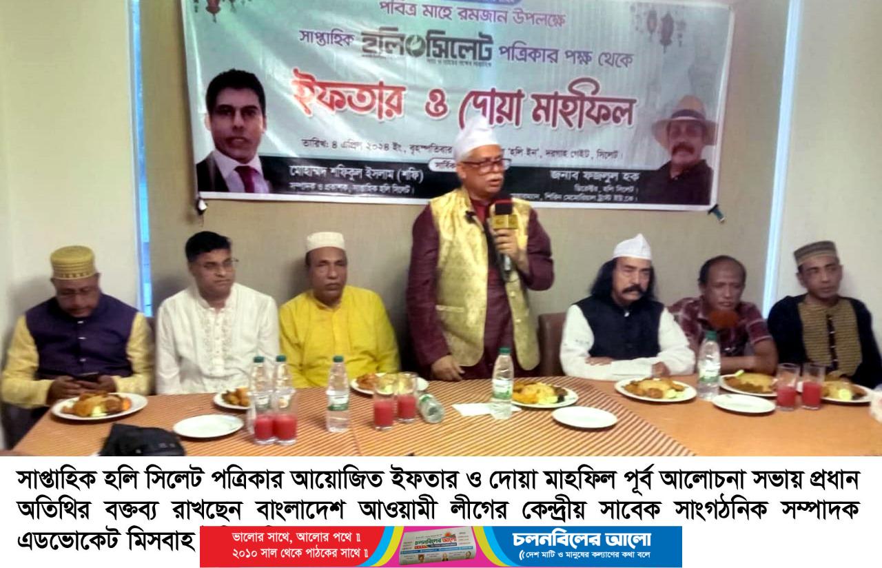 সাপ্তাহিক হলি সিলেটের ইফতার ও দোয়া মাহফিল আজ বাদ সন্ধ্যায় সিলেট নগরীর দরগাহ গেইটস্থ একটি চাইনিজ রেস্টুরেন্টে সম্পন্ন হয়েছে। সাপ্তাহিক হলি সিলেট পত্রিকার নির্বাহী সম্পাদক জহিরুল ইসলাম এর সভাপতিত্ব এবং দেশটিভি অনলাইন এর সম্পাদক হাসিবুল ইসলাম পিন্টু’র পরিচালনায় ইফতার ও দোয়া মাহফিল পূর্ব আলোচনা সভায় প্রধান অতিথির বক্তব্য বাংলাদেশ আওয়ামীলীগের তিনবারের নির্বাচিত সাবেক সাংগঠনিক সম্পাদক এডভোকেট মিসবাহ উদ্দিন সিরাজ।