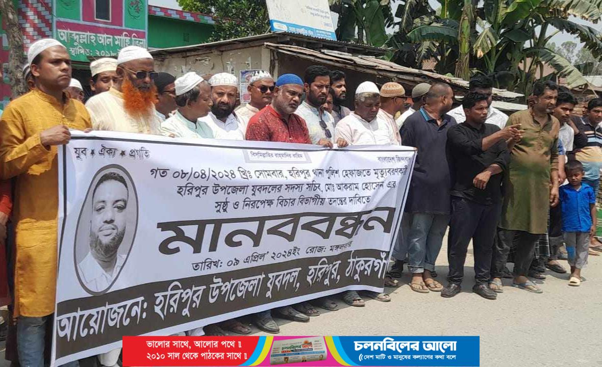 ঠাকুরগাঁওয়ের হরিপুরে যুবদলের সদস্য সচিব আকরাম হোসেন(৪০)পুলিশের হেফাজতে মৃত্যুর ঘটনার প্রতিবাদে সুষ্ঠ ও নিরপেক্ষ তদন্ত ও বিচারের দাবিতে মানববন্ধন অনুষ্ঠিত হয়েছে। ময়না তদন্ত শেষে পুলিশ লাশ পরিবারের কাছে হস্তান্তর করলে আজ মঙ্গলবার ৯ এপ্রিল সকাল ১১ টায় মৃতের জানাজা শেষে হরিপুর উপজেলা যুবদলের আয়োজনে মৃতের বাড়ির সামনে পাকা সড়কের উপর সকাল সাড়ে ১১ টায় মানববন্ধন করা হয়েছে। এতে বক্তব্য রাখেন ঠাকুরগাঁও -২ আসনের বিএনপির সাবেক সংসদ সদস্য জেড মর্তুজা চৌধুরী তুলা, জেলা যুবদলের সম্পাদক মাহাবুবুর আলম তুহিন, ঠাকুরগাঁও জেলা যুবদলের সাংগঠনিক সম্পাদক জাহিদুল ইসলাম জাহিদ, জেলা যুবদল নেতা লিটন, উপজেলা বিএনপির ভারপ্রাপ্ত সভাপতি জামাল উদ্দিন, সাবেক সম্পাদক ইসমাইল হোসেন প্রমুখ। উল্লেখ্য যে, গত রবিবার রাতে হরিপুর থানা পুলিশ মাদক বিরোধী অভিযান চালিয়ে মাদক সহ তাকে থানায় ধরে নিয়ে আসে। সোমবার দুপুরে আসামী ঠাকুরগাঁও জেল হাজতে পাঠানোর সময় সে অসুস্থ বোধ করলে তৎক্ষনাত থানা পুলিশ চিকিৎসার জন্য তাকে হরিপুর হাসপাতালে নিয়ে গেলে কর্তব্যরত ডাক্তার তাকে মৃত বলে ঘোষনা করে।