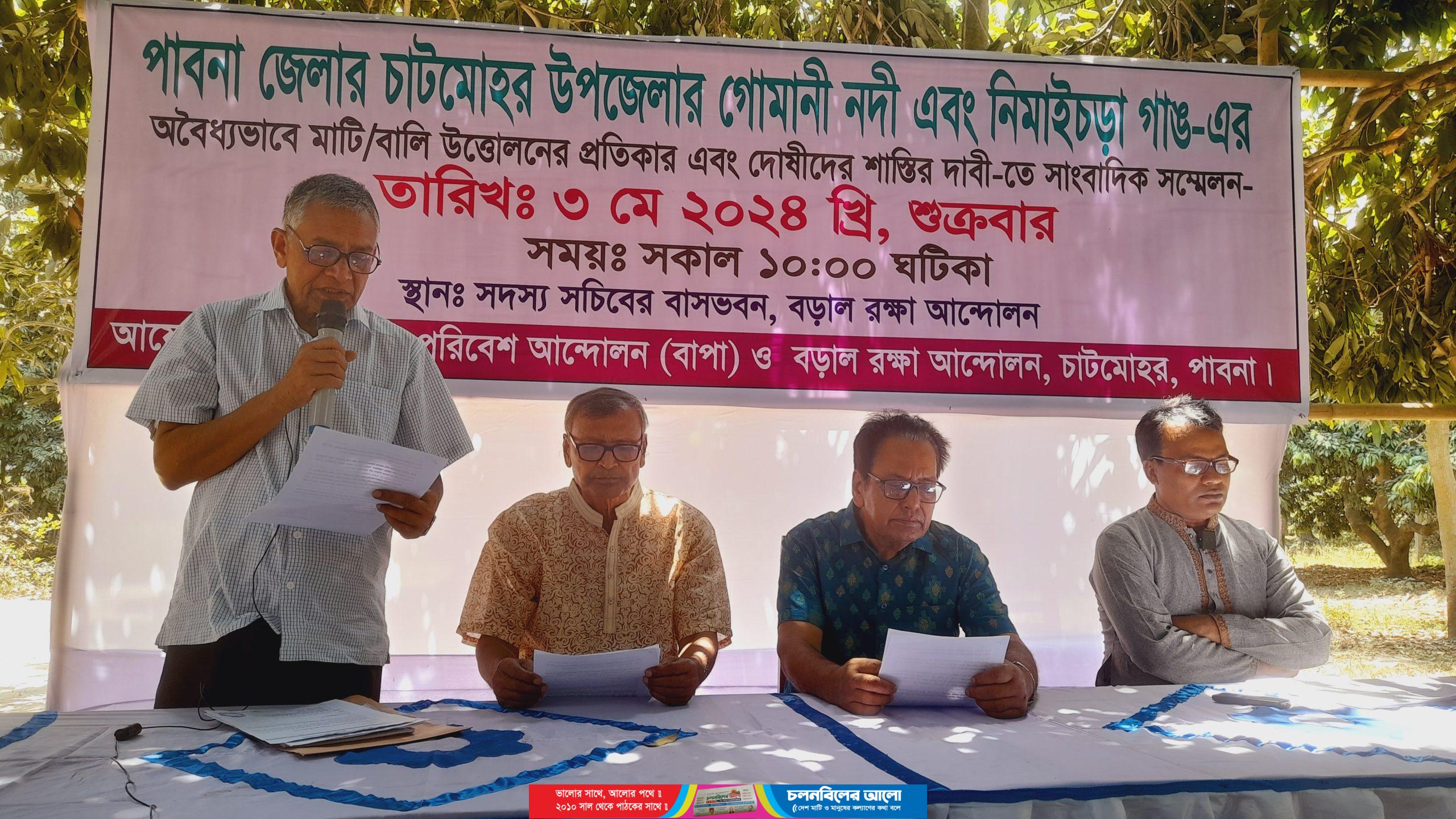 পাবনার চাটমোহরে নদী থেকে অবৈধ মাটি কাটা ও বালি উত্তোলনের প্রতিকারসহ দোষী ব্যক্তিদের শাস্তির দাবিতে সাংবাদিক সম্মেলন অনুষ্ঠিত হয়েছে। বাংলাদেশ পরিবেশ আন্দোলন (বাপা) ও বড়াল রক্ষা আন্দোলন চাটমোহরের পক্ষ থেকে উক্ত সাংবাদিক সম্মেলন করা হয়।
